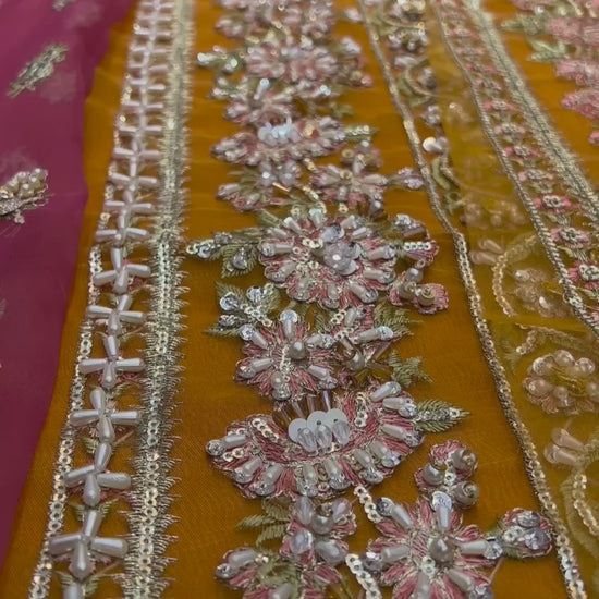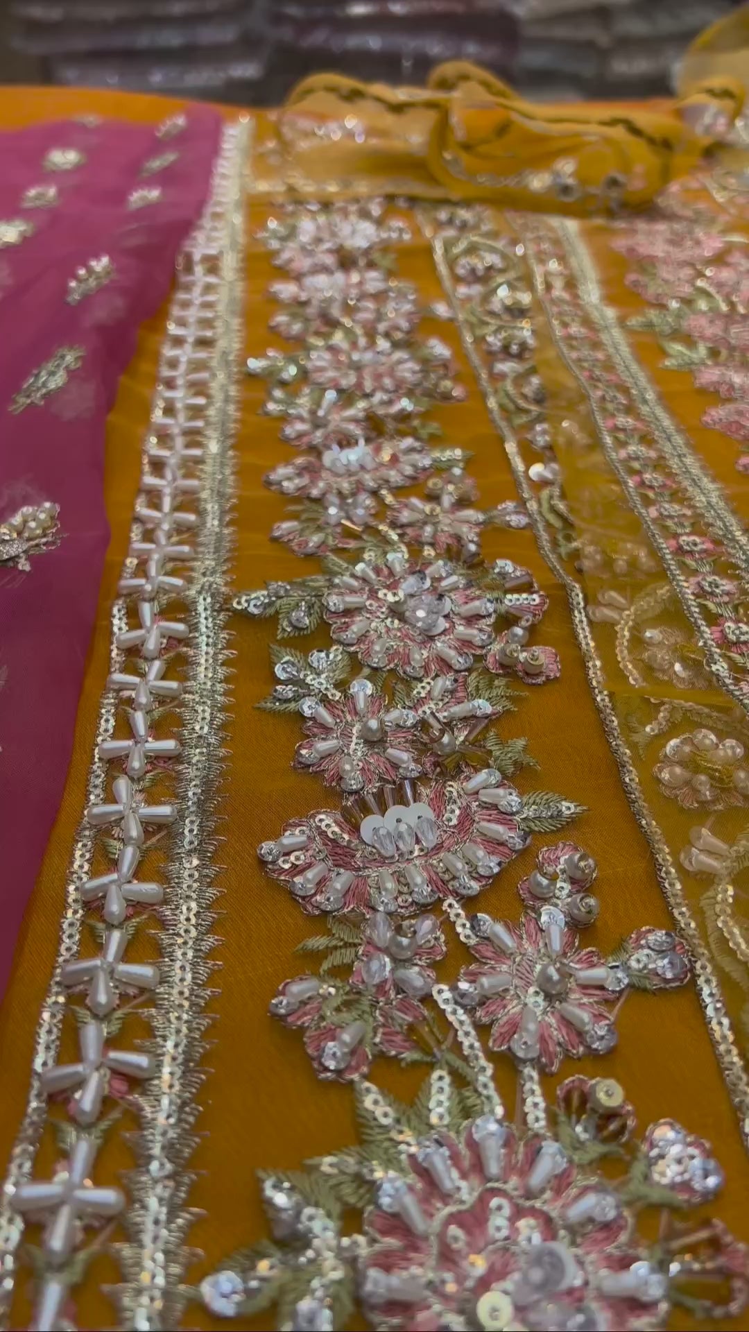 Discover the beauty and elegance of our Mehndi Galore dress. Hand-sequenced and embroidered on luxurious organza, this dress is perfect for any special occasion. The flowing plazoo adds a touch of grace and comfort. Get ready to stand out in style with Mehndi Galore.