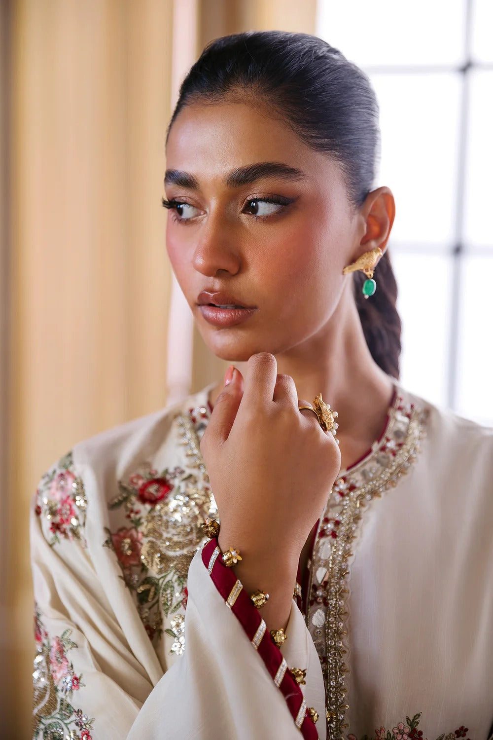 This stunning ensemble is a perfect blend of sophistication and style. The striking lemon ice off white shirt is enriched with vibrant embroidery, showcasing intricate floral motif designs and eye-catching accents with scintillating details. Paired with a classic embroidered shalwar portrayed in a contrasted deep maroon color, this outfit is a must-have for any festive occasion.