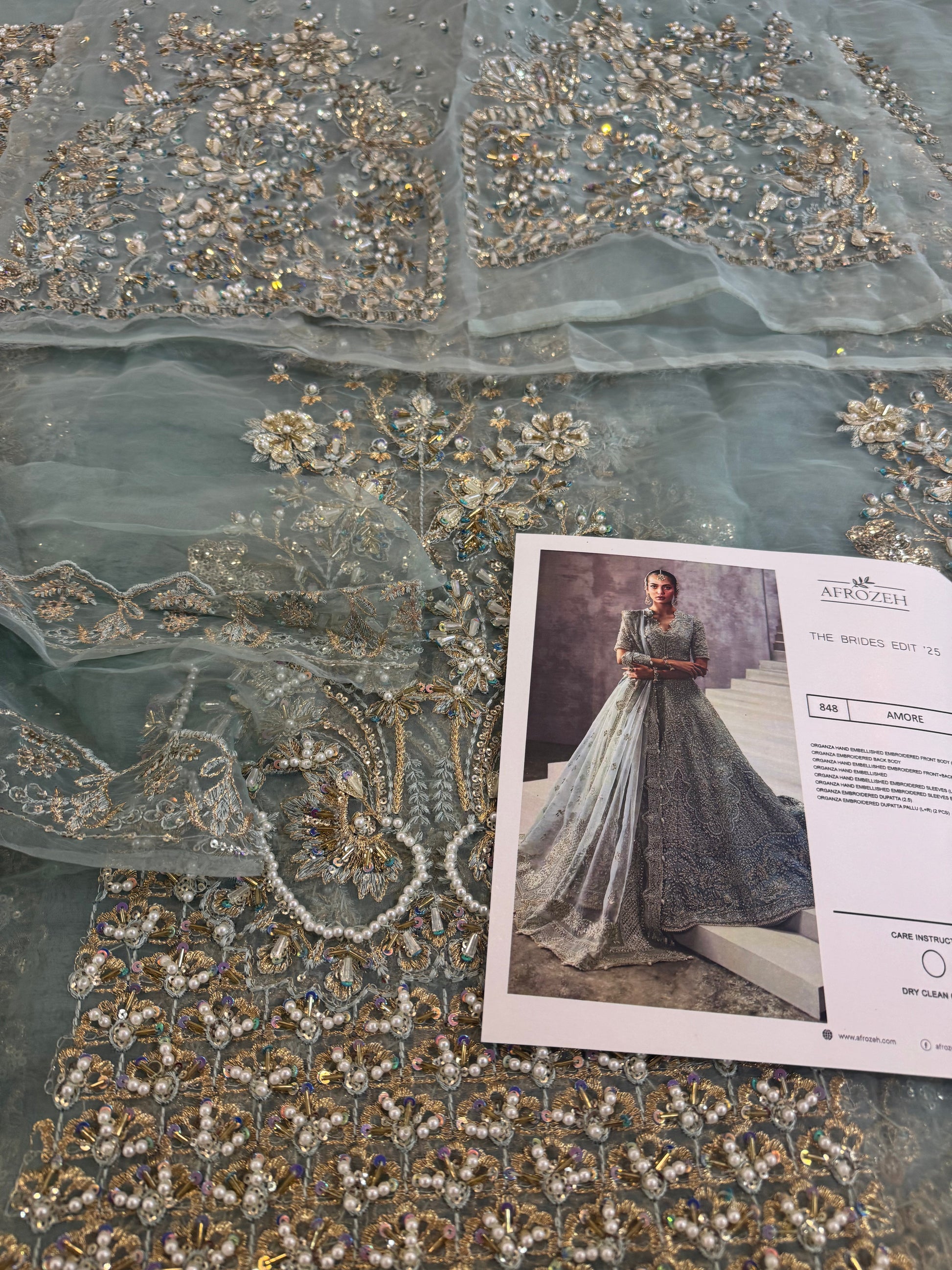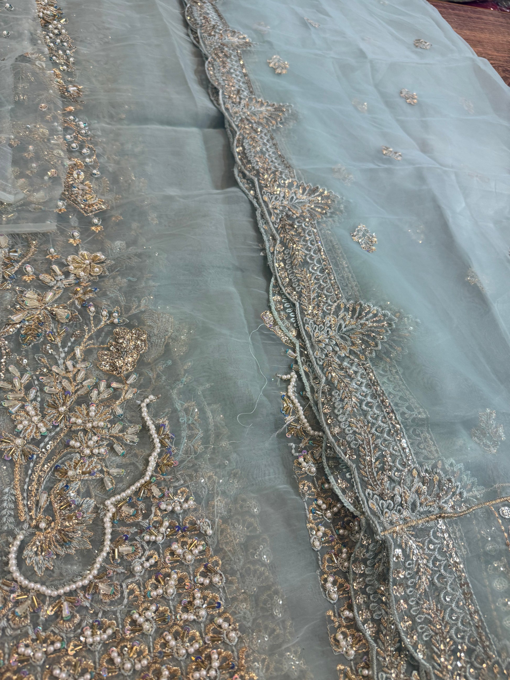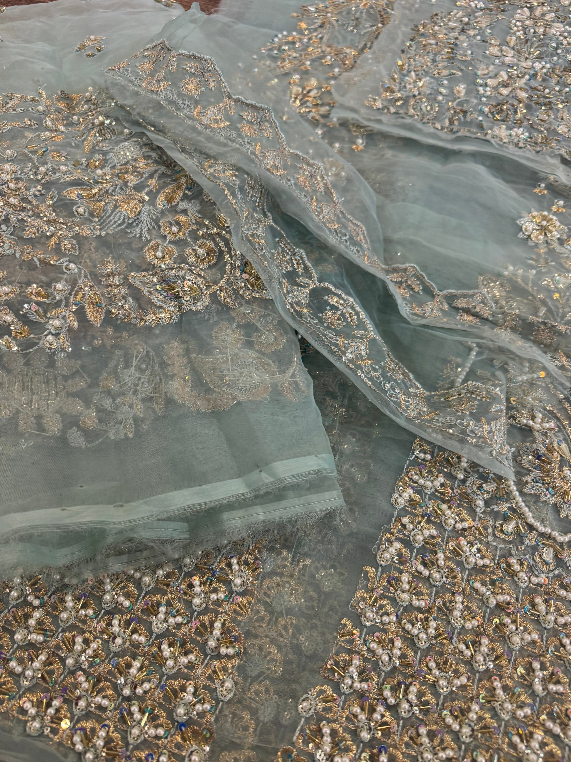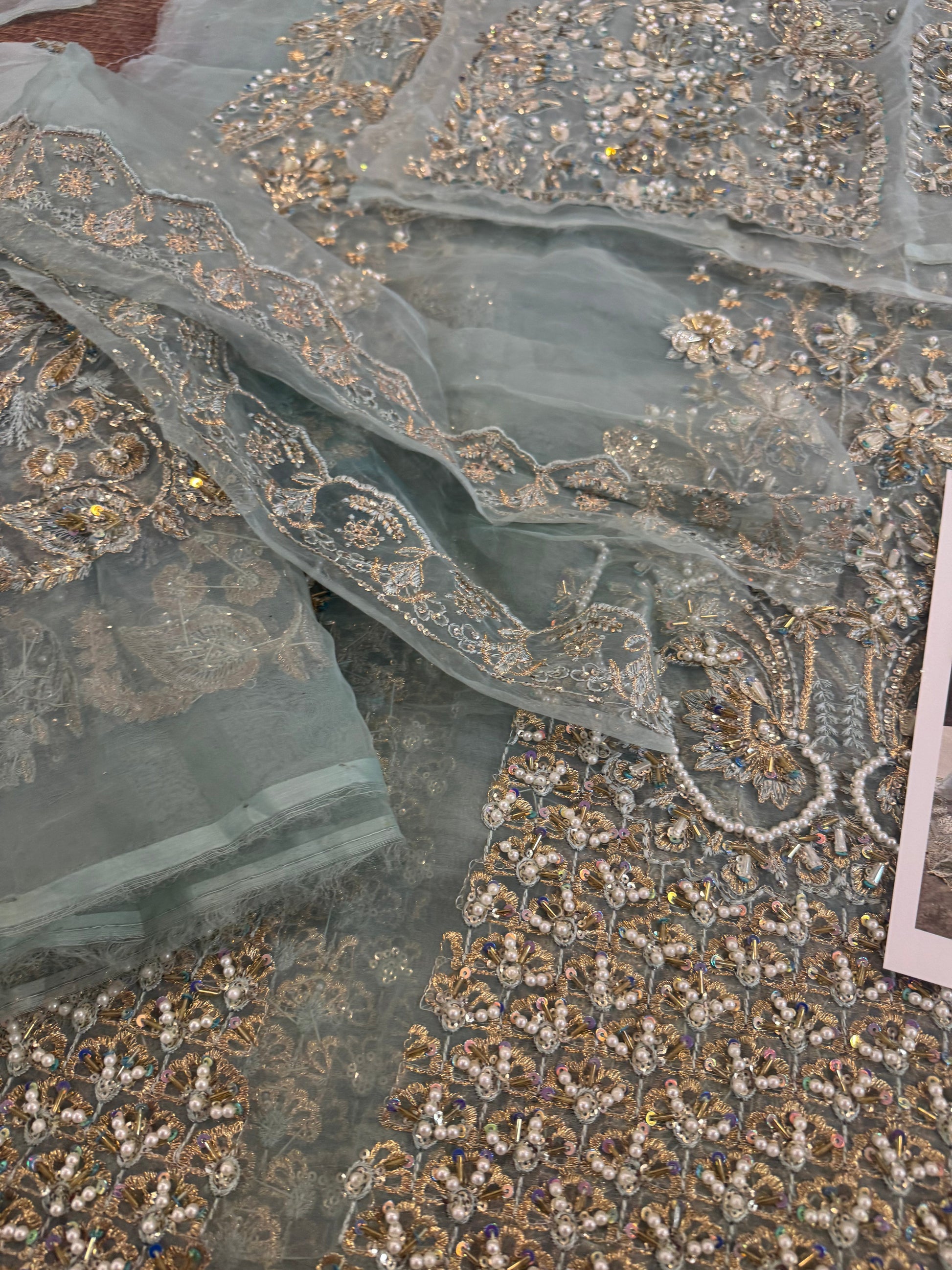 This gorgeous turquoise lehenga choli is a fascinating fusion of classic creativity and everlasting beauty that exudes appealing attractiveness. The choli features a jewel-like neckline, crafted from sheer organza and adorned with intricate patterns brought to life through meticulous hand embellishments. A mesmerizing interplay of light gold tilla, sequins, panni, pearls, and cut dana work creates a dazzling tapestry of artistry. The flared lehenga showcases heavily embellished panels and stunning applique details, while the embroidered organza dupatta adds a delicate charm, elevating the glamour of this eternal masterpiece.