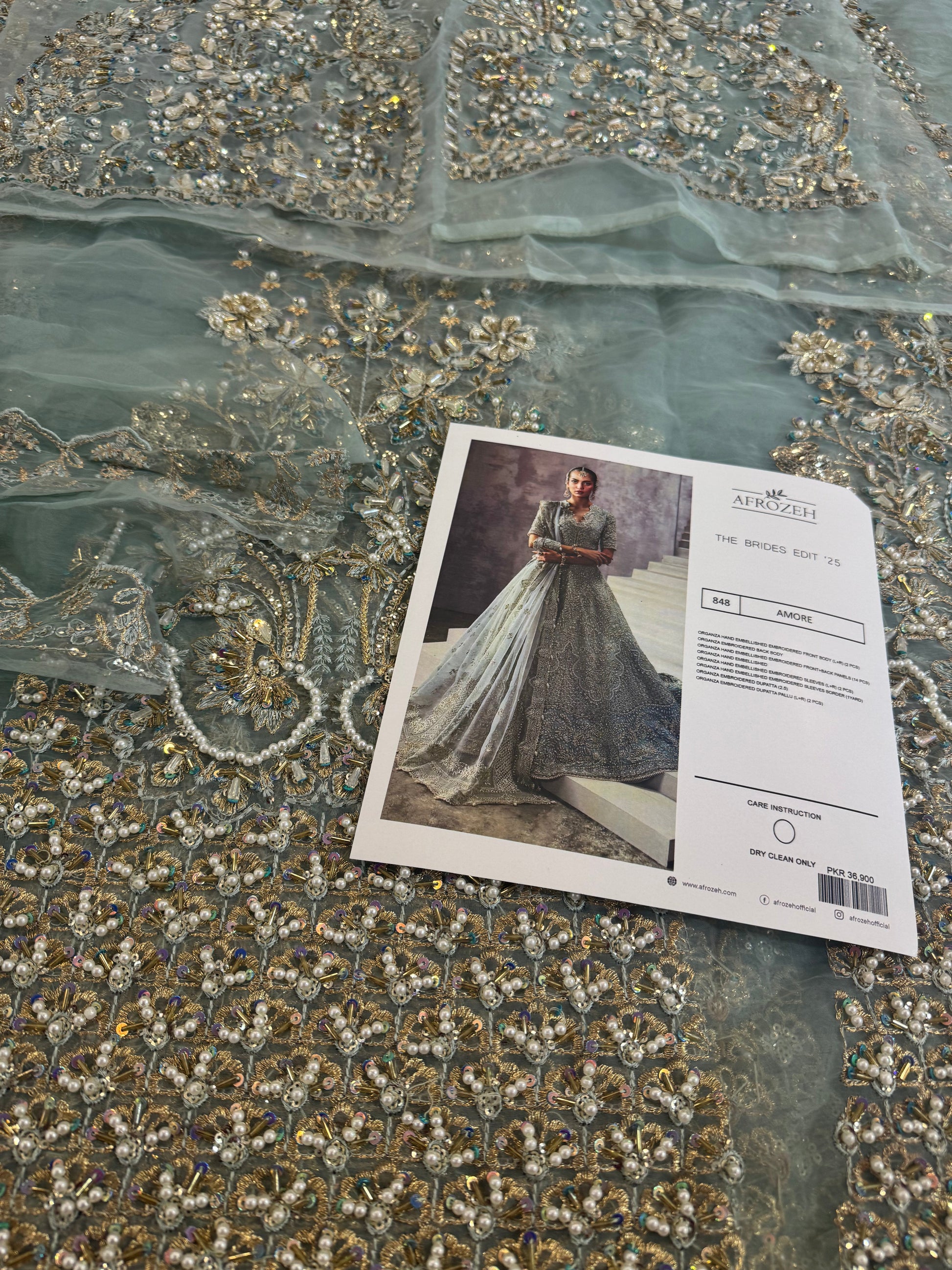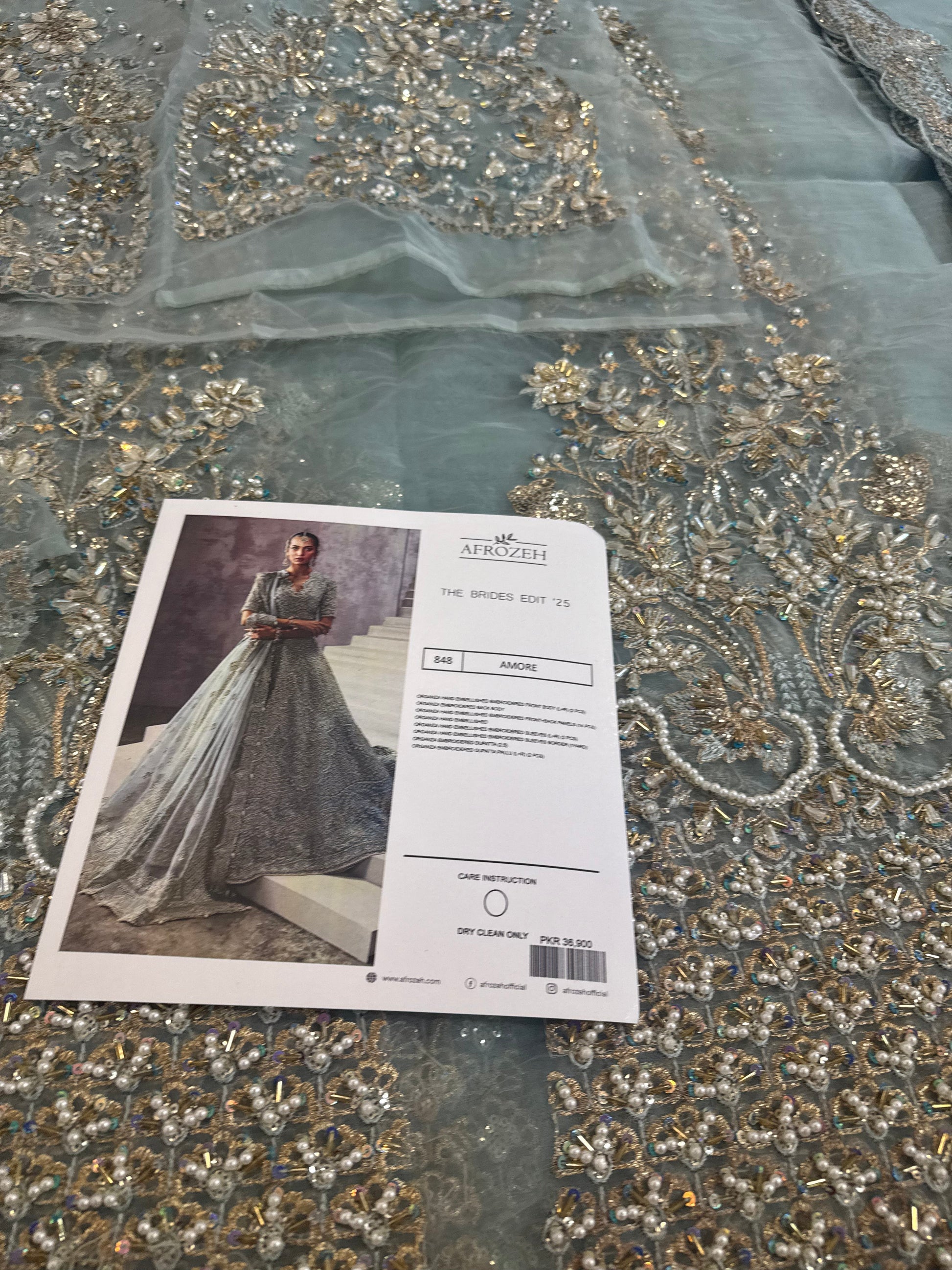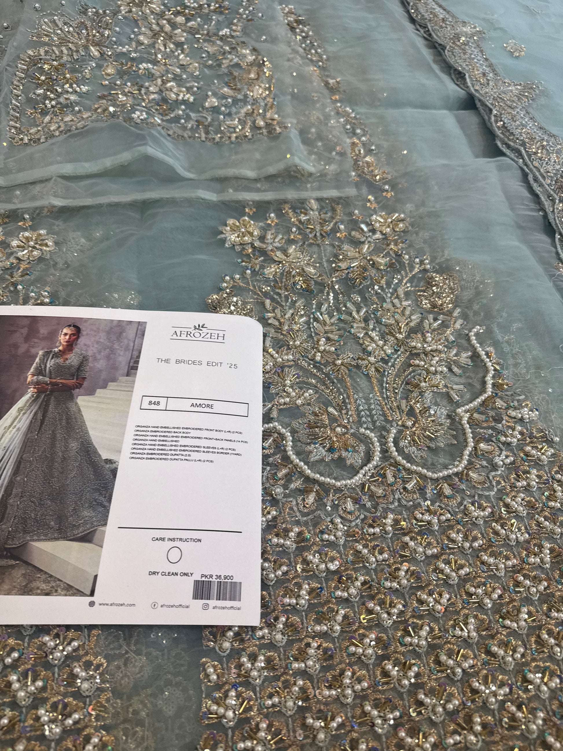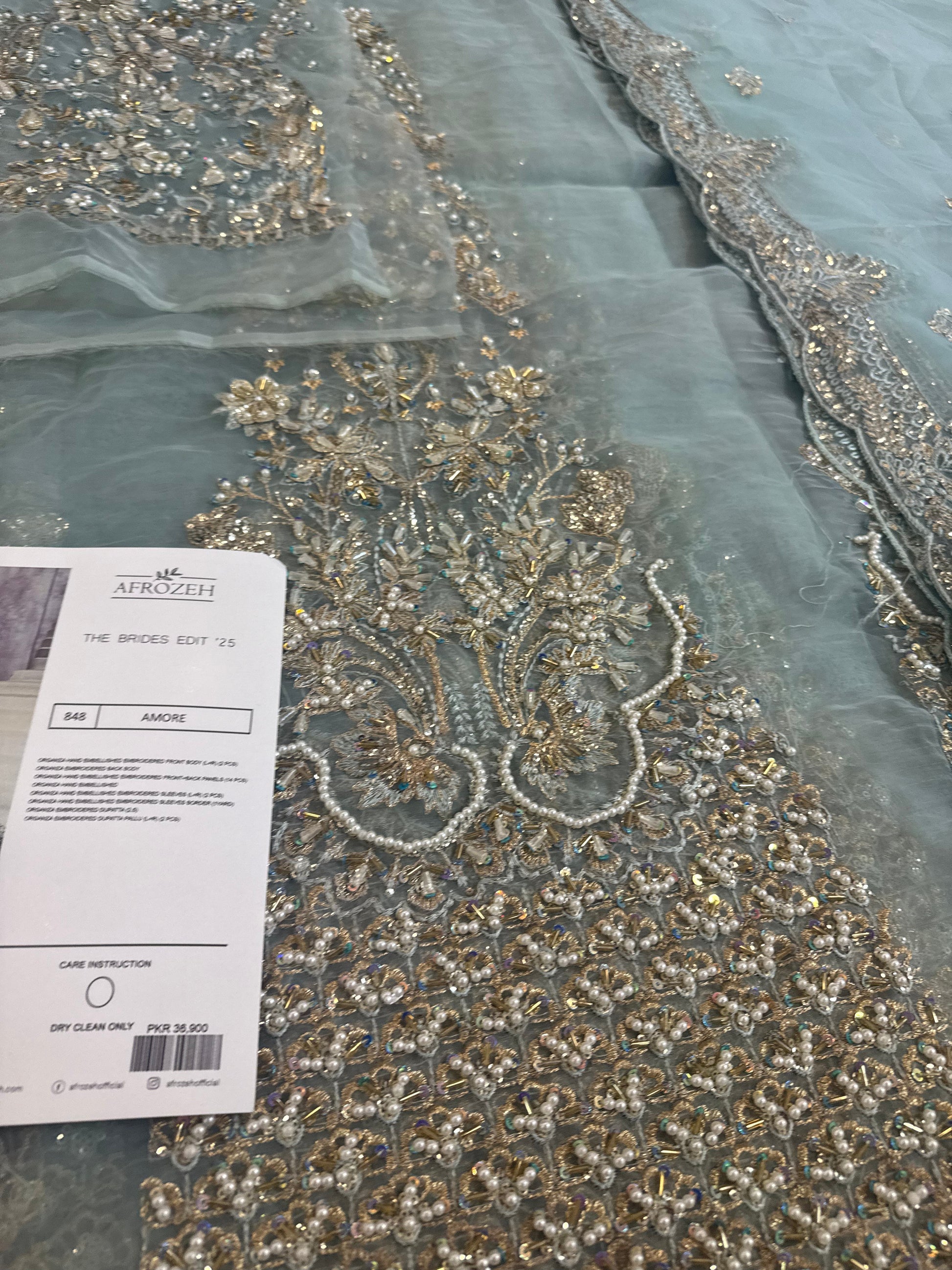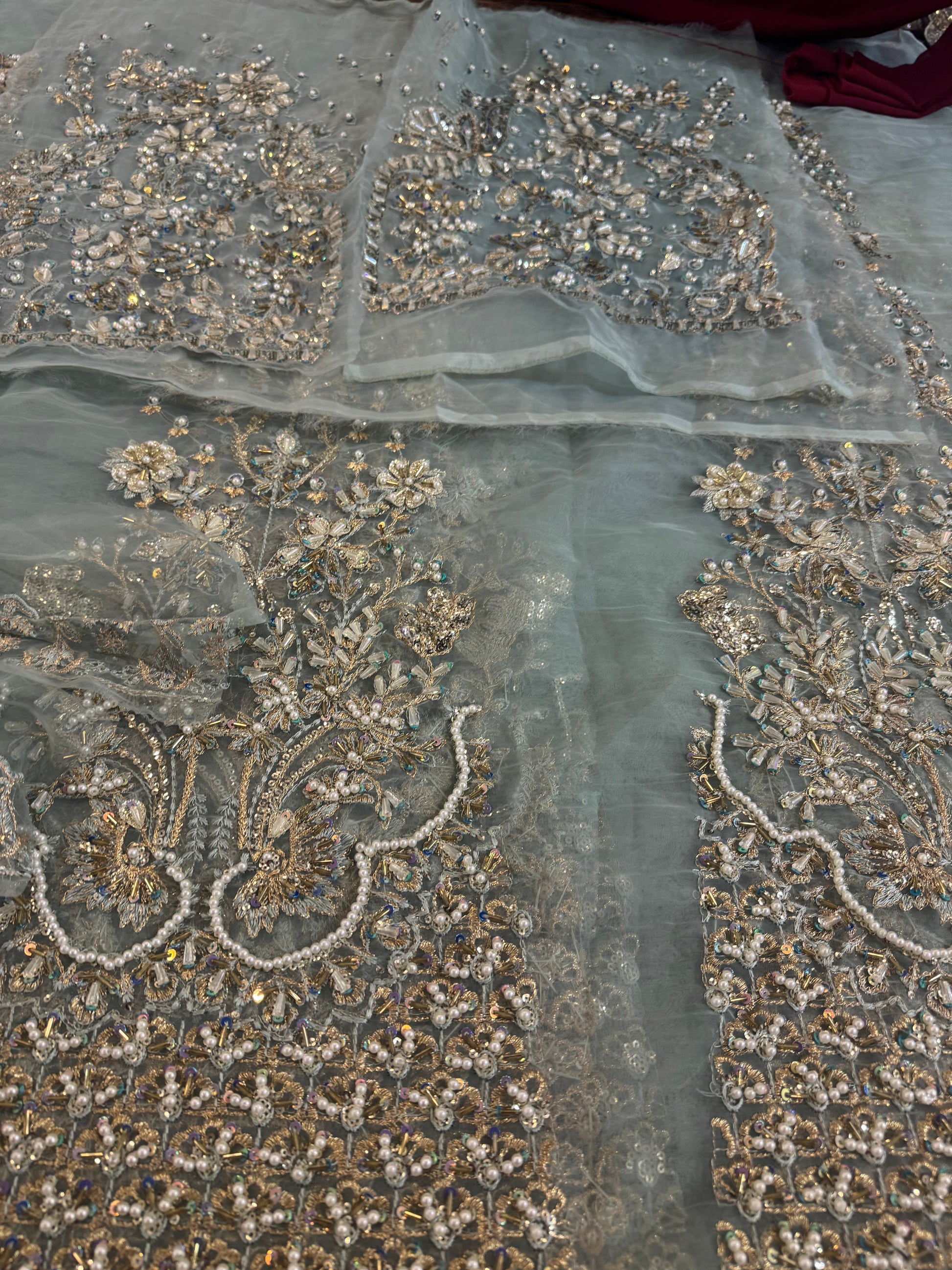 This gorgeous turquoise lehenga choli is a fascinating fusion of classic creativity and everlasting beauty that exudes appealing attractiveness. The choli features a jewel-like neckline, crafted from sheer organza and adorned with intricate patterns brought to life through meticulous hand embellishments. A mesmerizing interplay of light gold tilla, sequins, panni, pearls, and cut dana work creates a dazzling tapestry of artistry. The flared lehenga showcases heavily embellished panels and stunning applique details, while the embroidered organza dupatta adds a delicate charm, elevating the glamour of this eternal masterpiece.