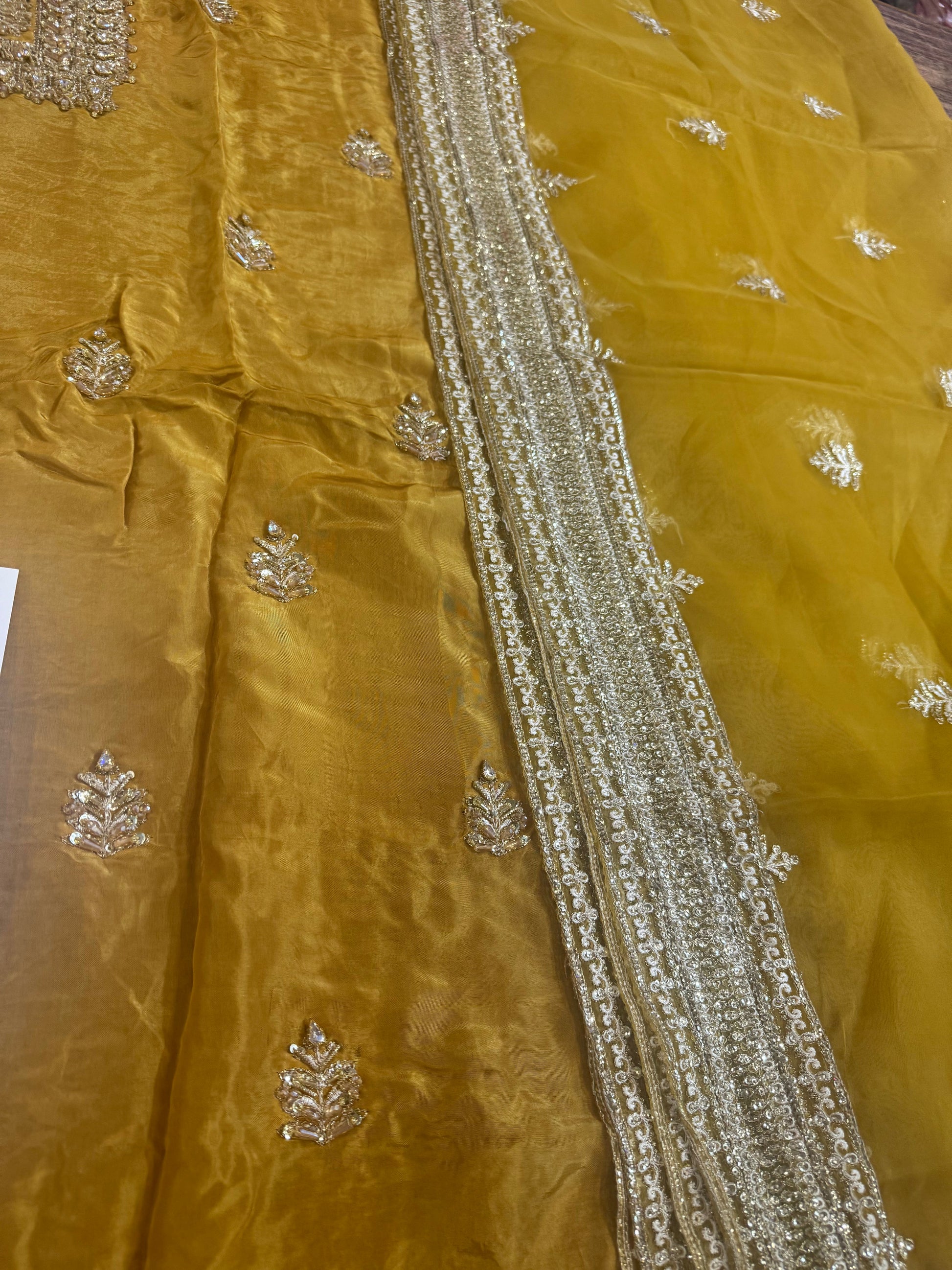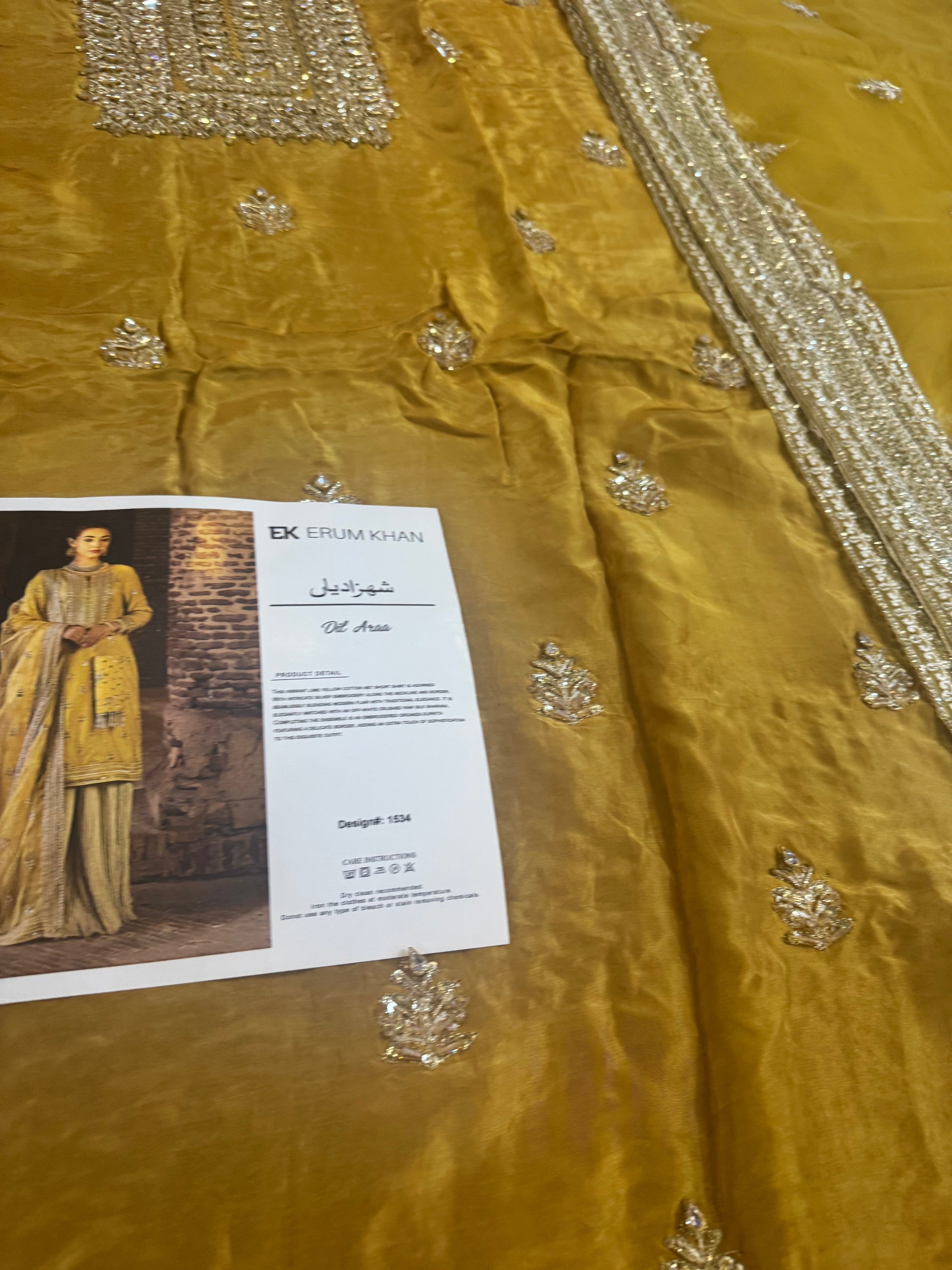 This vibrant lime yellow short shirt is adorned with intricate embroidery along the neckline and border, seamlessly blending modern flair with traditional elegance. It is elegantly matched with an off-white crushed raw silk sharara. Completing the ensemble is an embroidered organza dupatta featuring a delicate border, adding an extra touch of sophistication to this exquisite outfit.