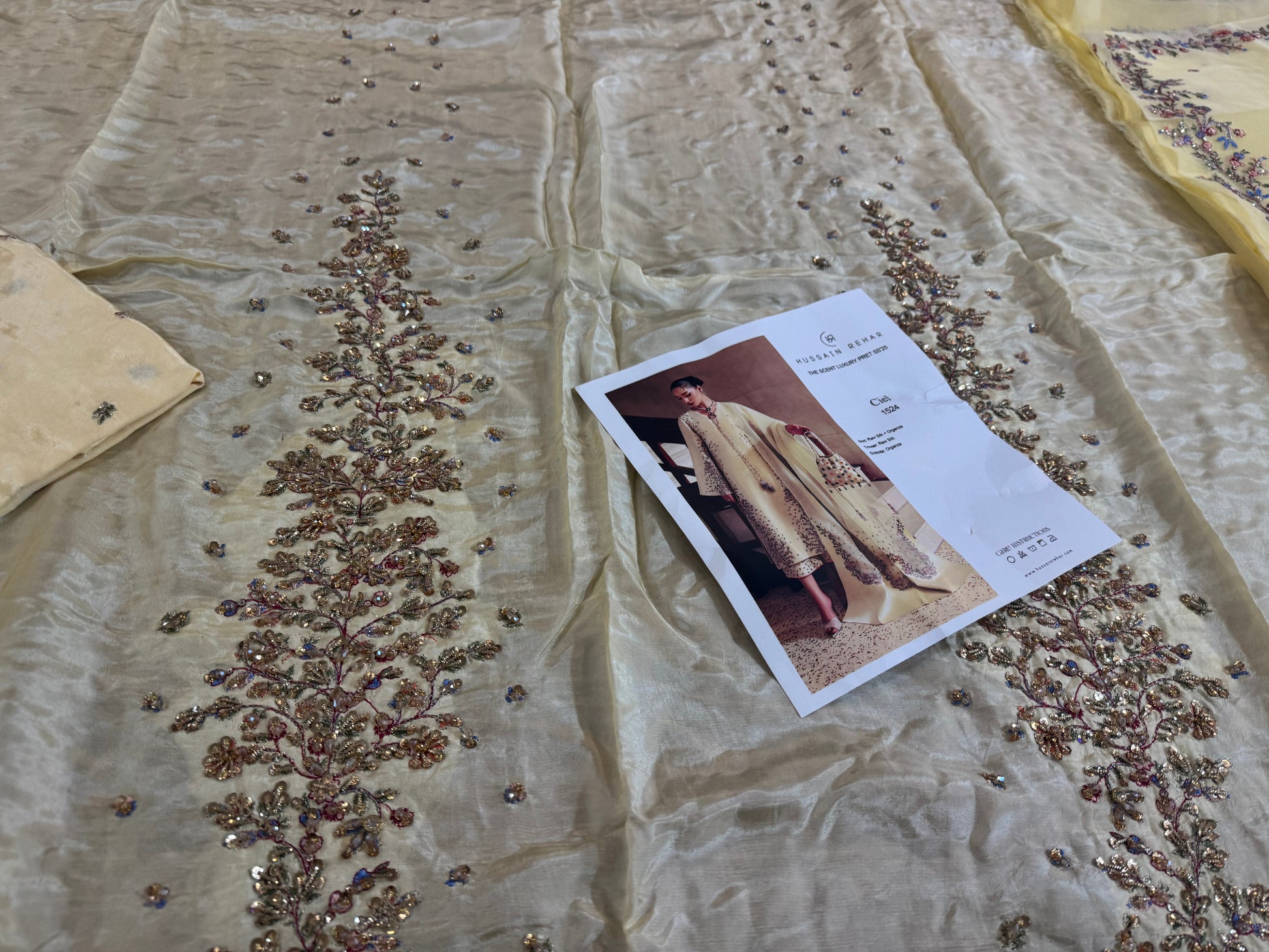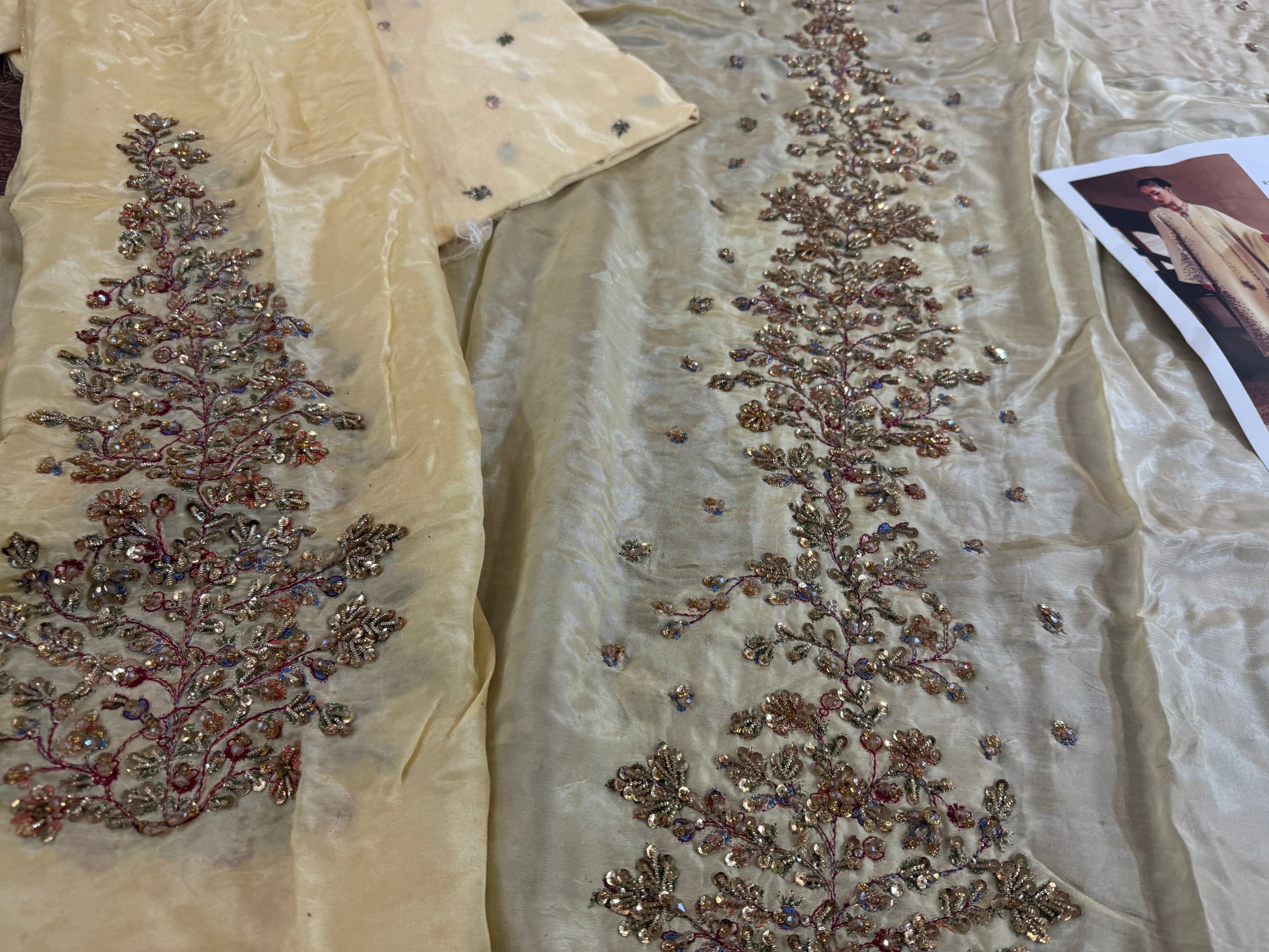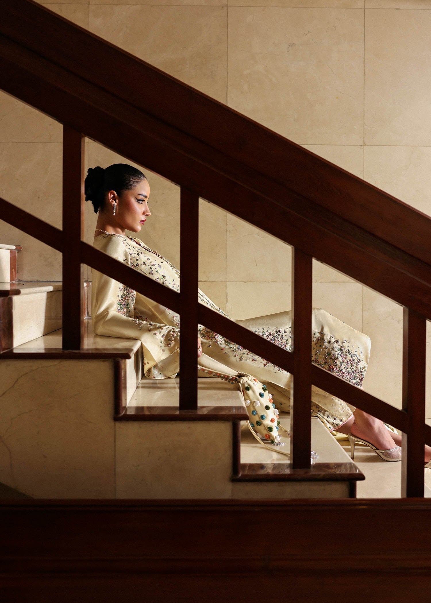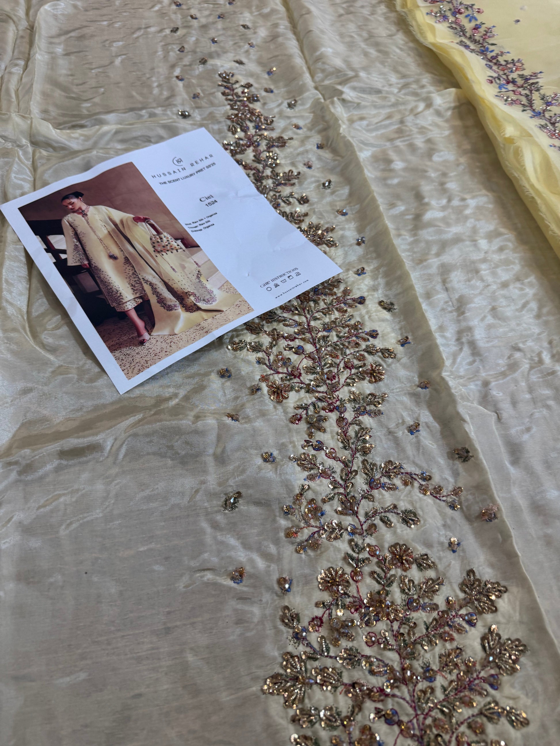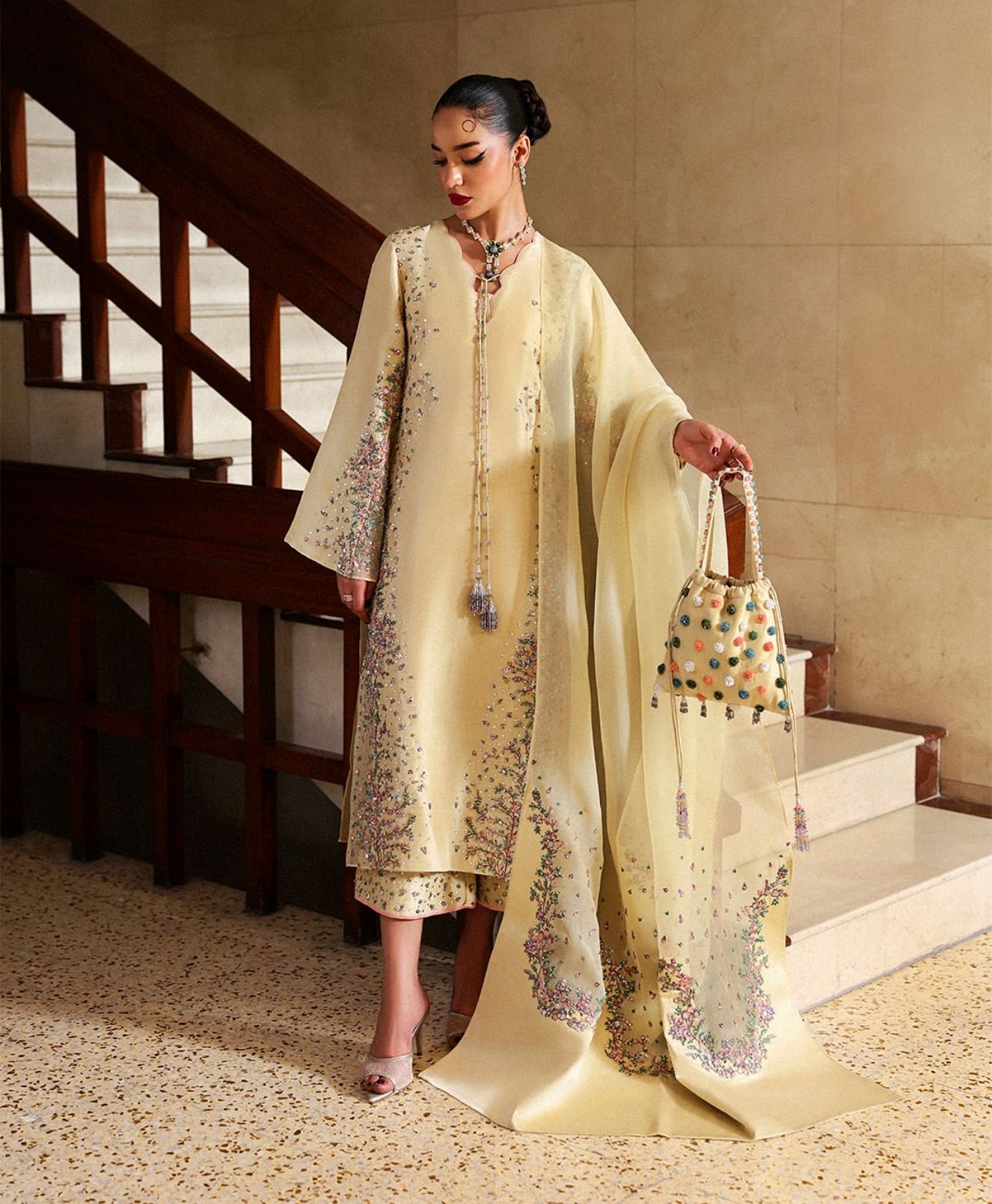 A butter yellow pure raw silk shirt, paneled with contrasting textures of silk and organza across the front and sleeves. Intricate floral embroidery, embellished with sequins and cutdana, brings delicate shimmer to the side panels and sleeves. Paired with matching culottes, finished with pink silk accents for a touch of contrast. The look is completed with a sheer organza dupatta, embroidered along the hem, framed with satin silk trims.