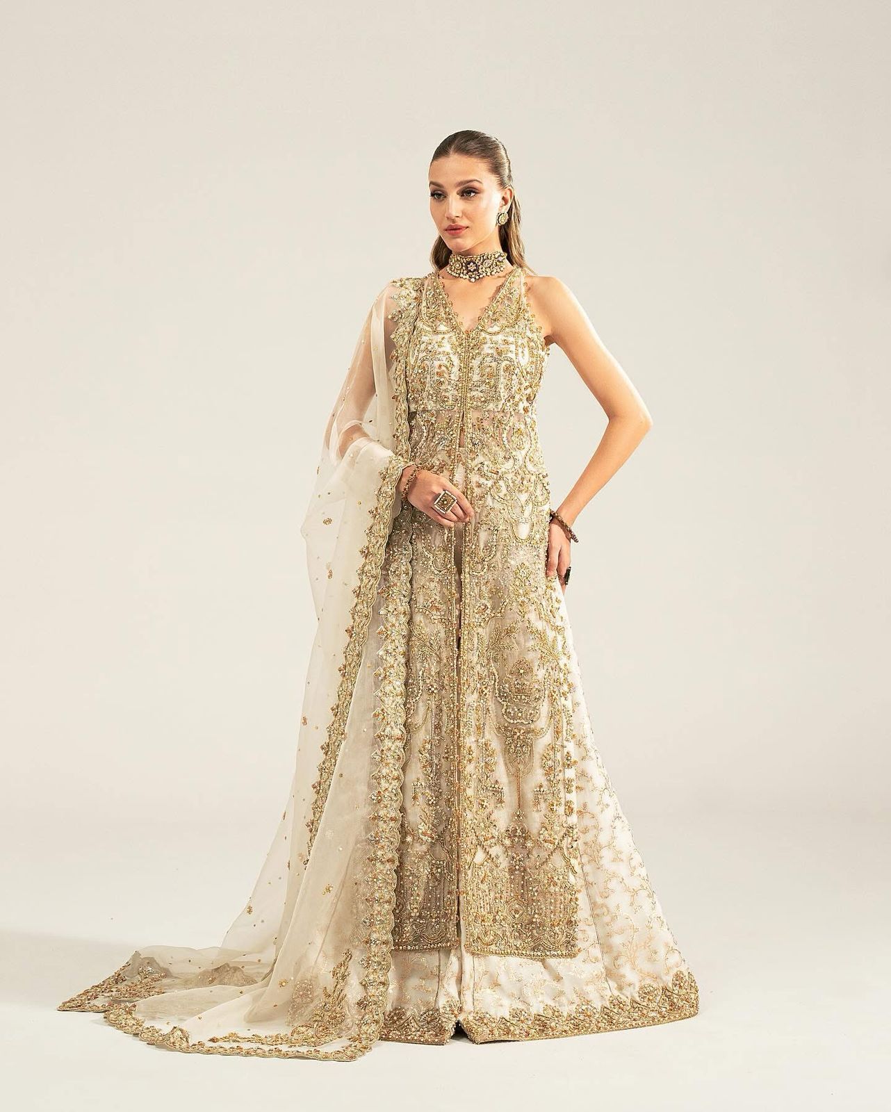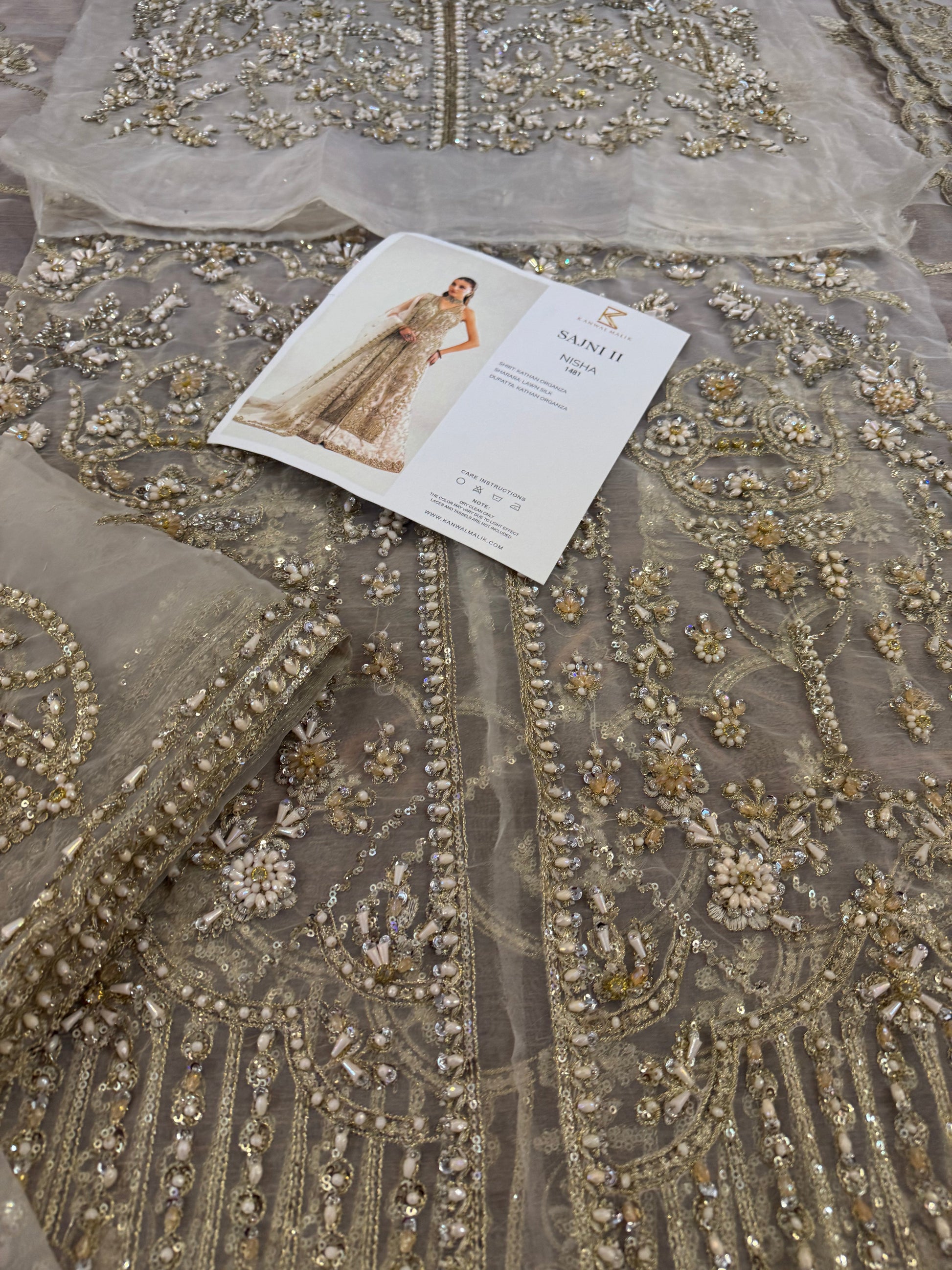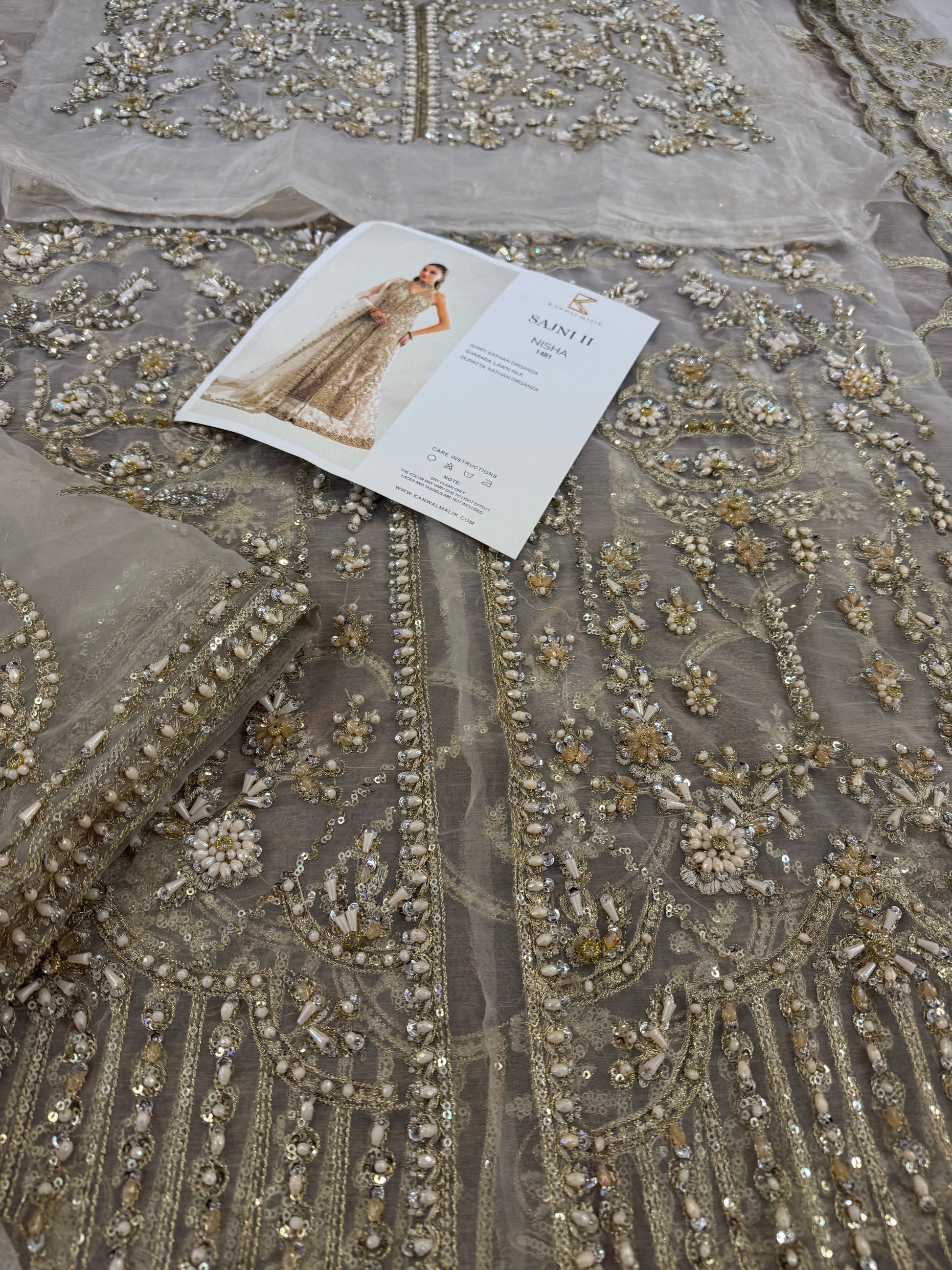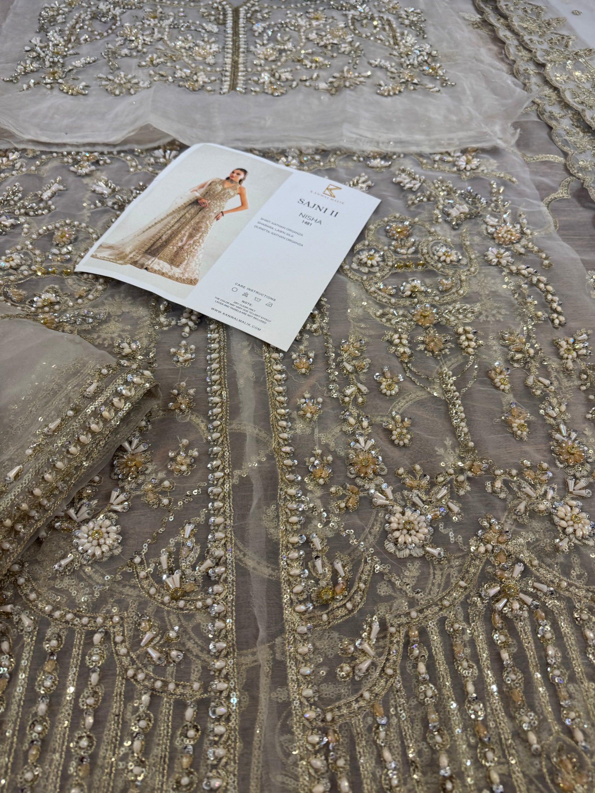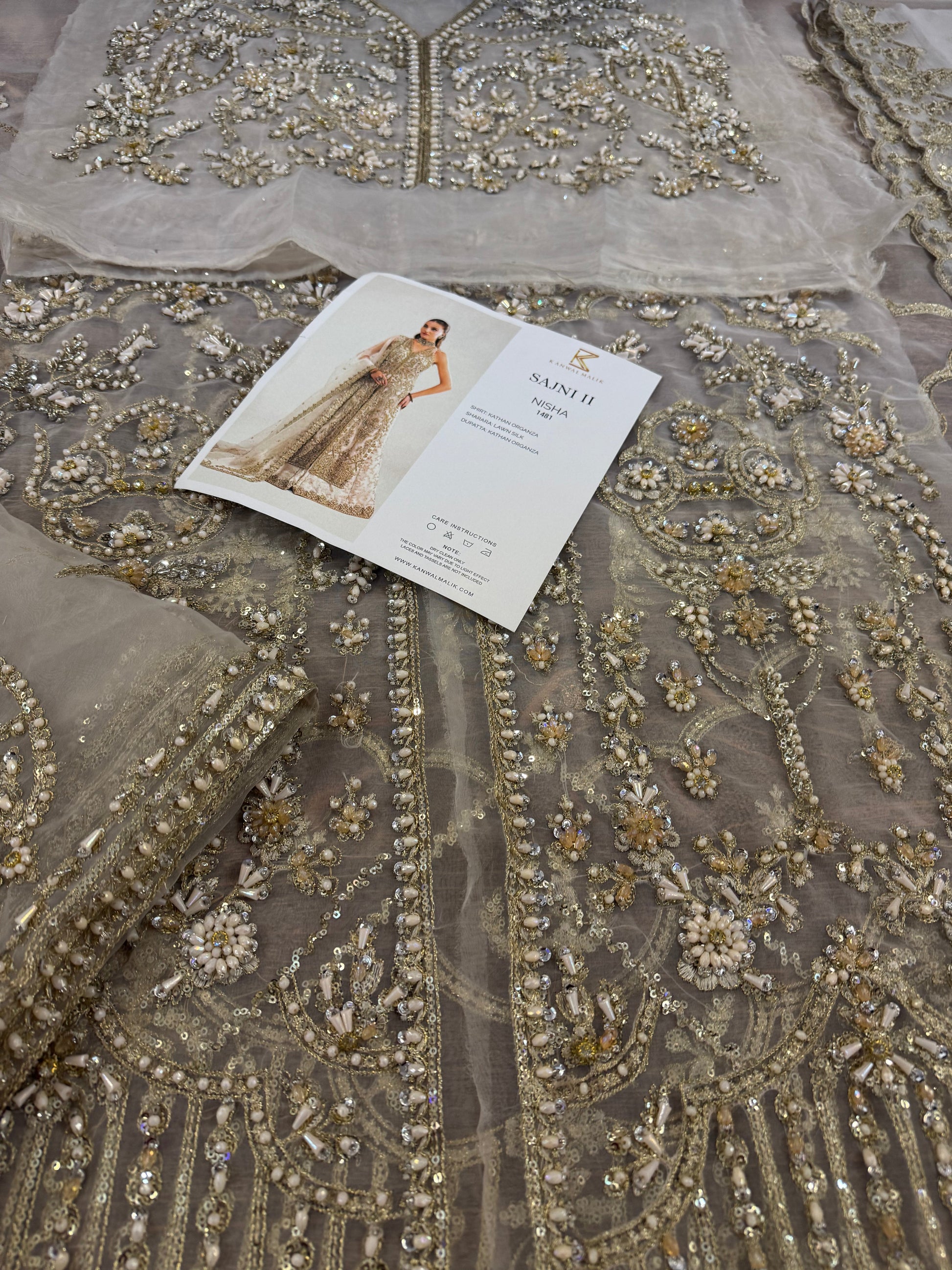 This elegant ivory ensemble features a straight shirt with a front open slit, paired with a sharara and dupatta. The shirt, crafted from luxurious Kathan organza, is meticulously hand-embellished with a dazzling array of sequins, crystals, naqshi, and dabka, creating a radiant and intricate design. It is beautifully complemented by a lawn silk sharara that adds a touch of richness and flow. The look is completed with a Kathan organza dupatta, adorned with a mesmerizing spray of sequins that enhances its ethereal charm. This ensemble is perfect for making a sophisticated and unforgettable statement at any special occasion.