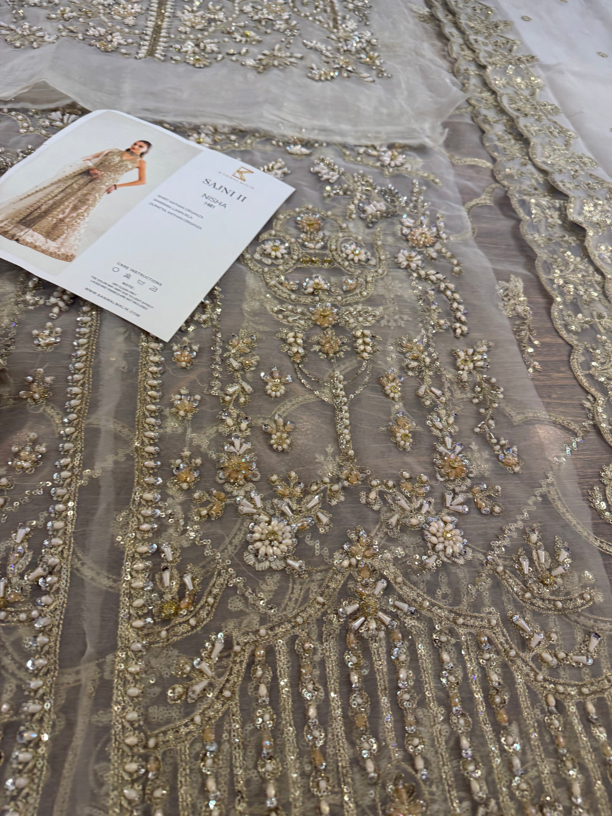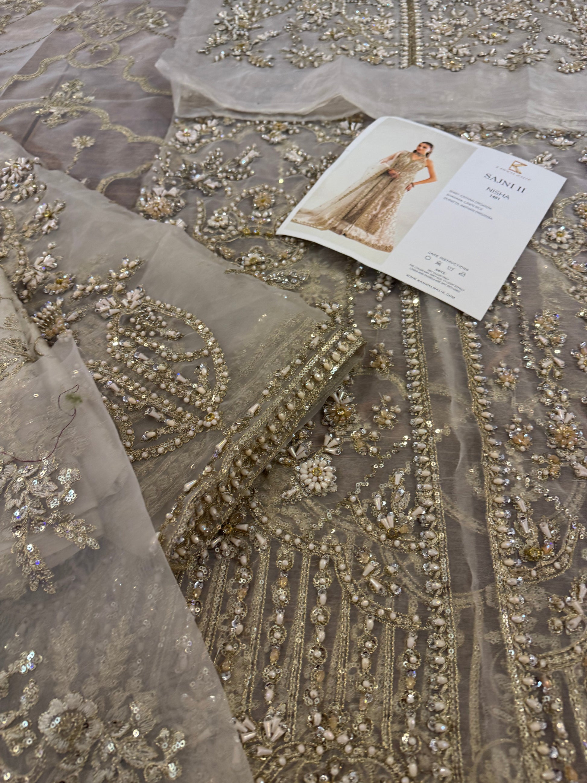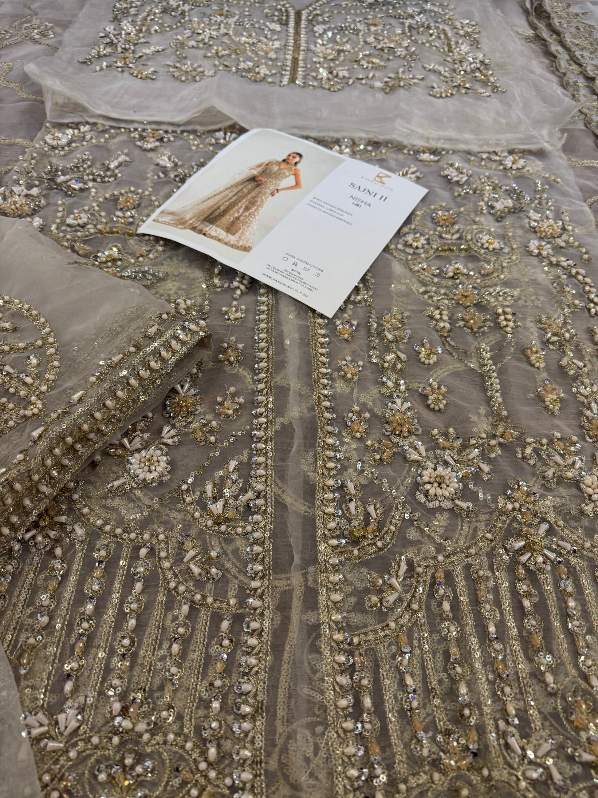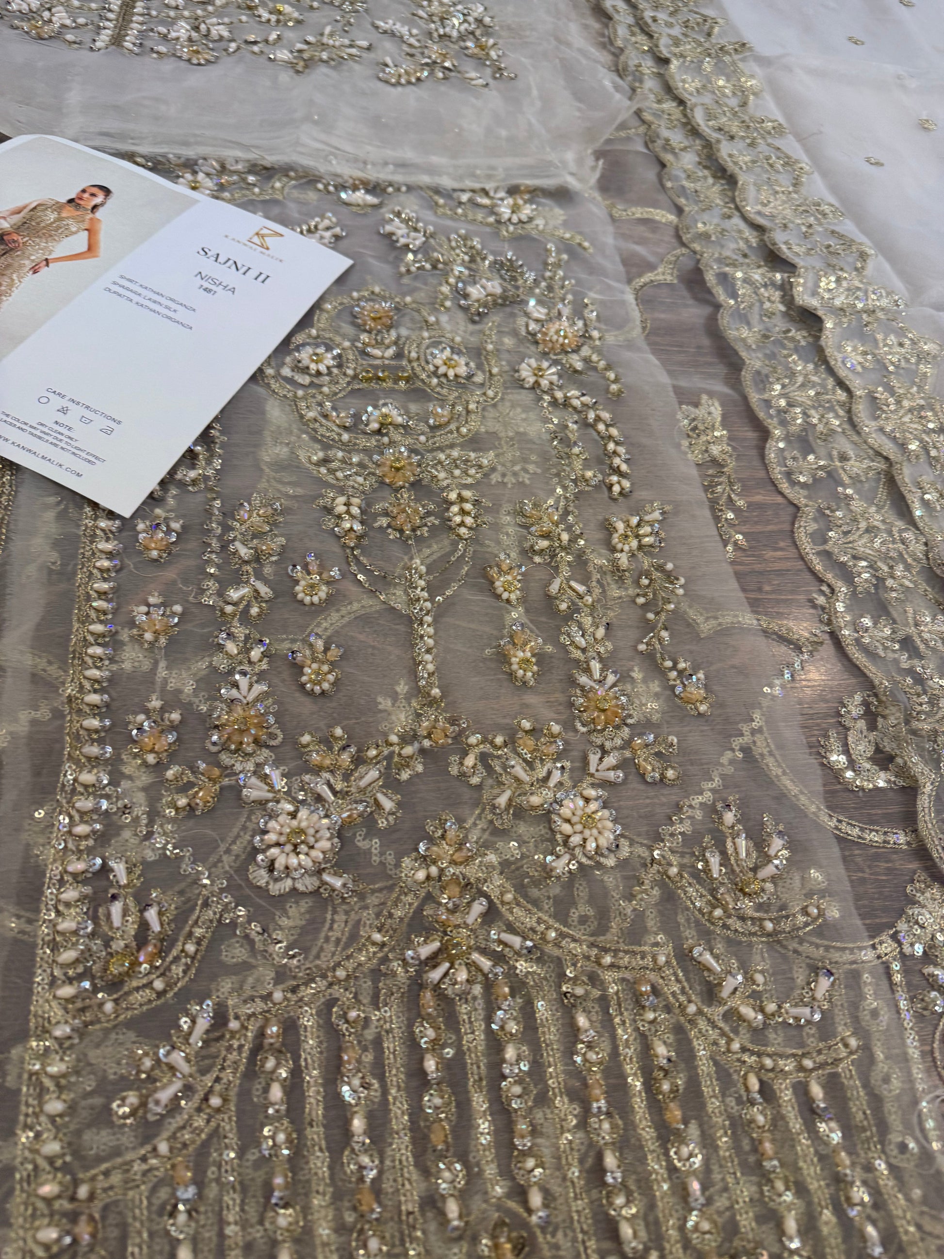 This elegant ivory ensemble features a straight shirt with a front open slit, paired with a sharara and dupatta. The shirt, crafted from luxurious Kathan organza, is meticulously hand-embellished with a dazzling array of sequins, crystals, naqshi, and dabka, creating a radiant and intricate design. It is beautifully complemented by a lawn silk sharara that adds a touch of richness and flow. The look is completed with a Kathan organza dupatta, adorned with a mesmerizing spray of sequins that enhances its ethereal charm. This ensemble is perfect for making a sophisticated and unforgettable statement at any special occasion.