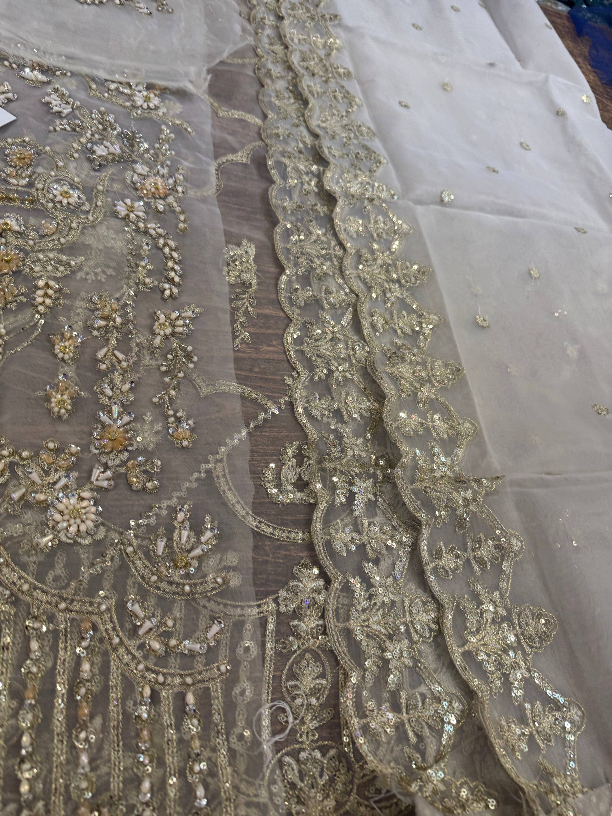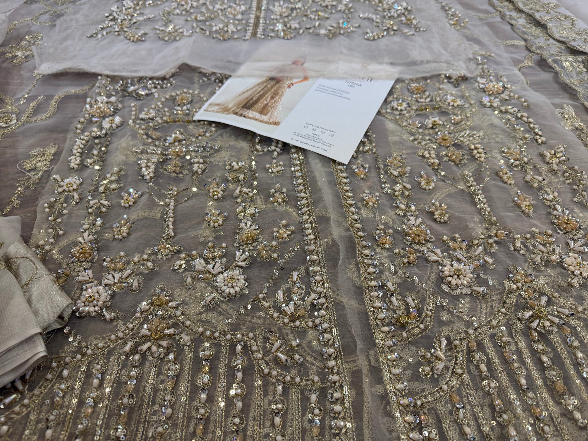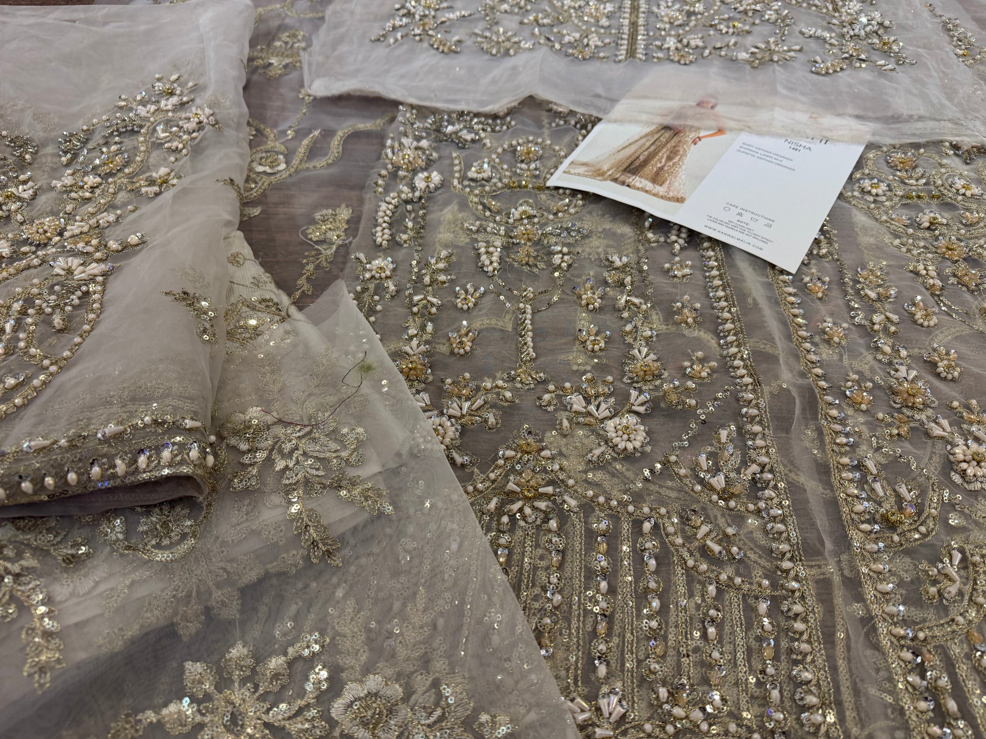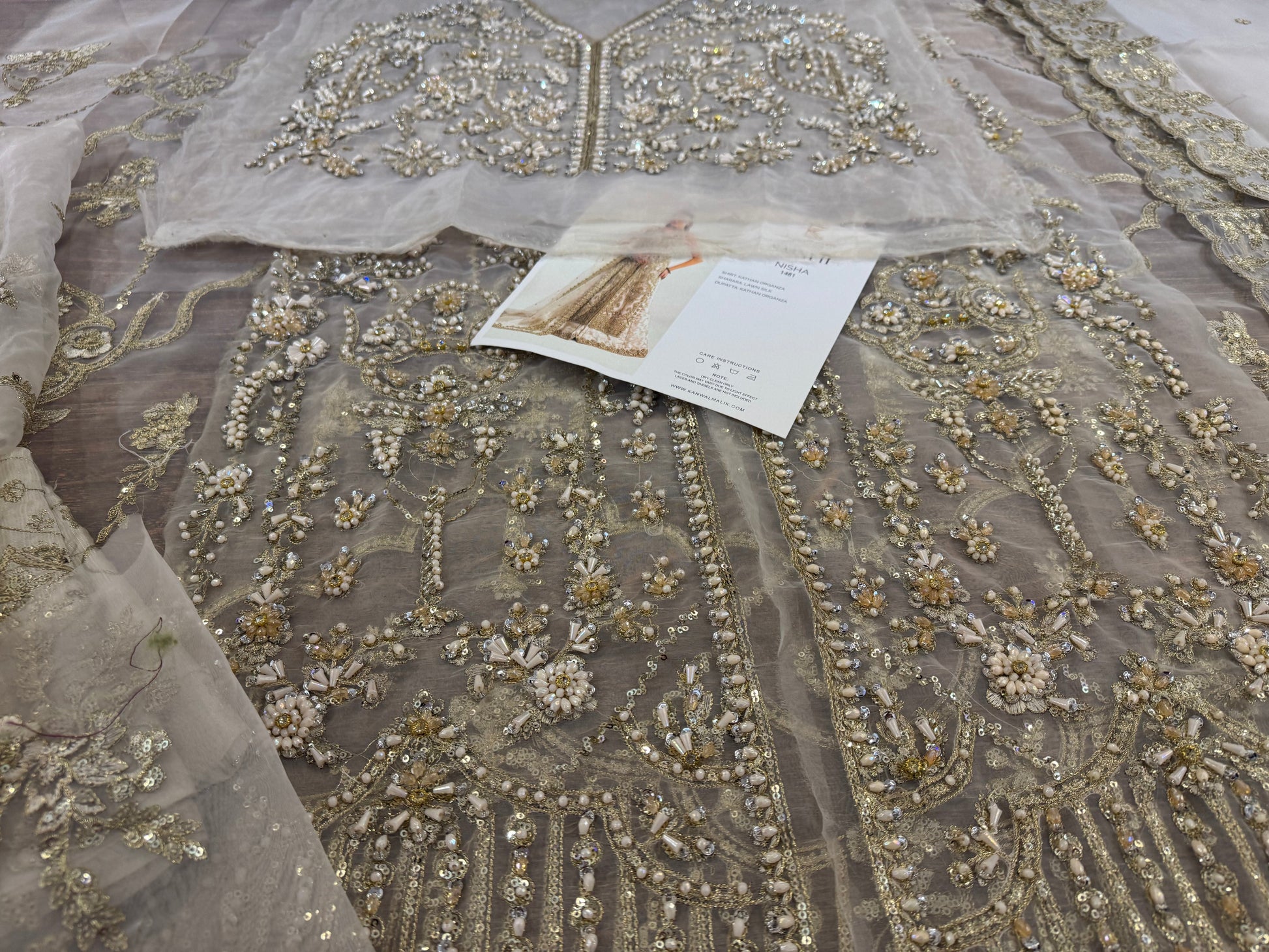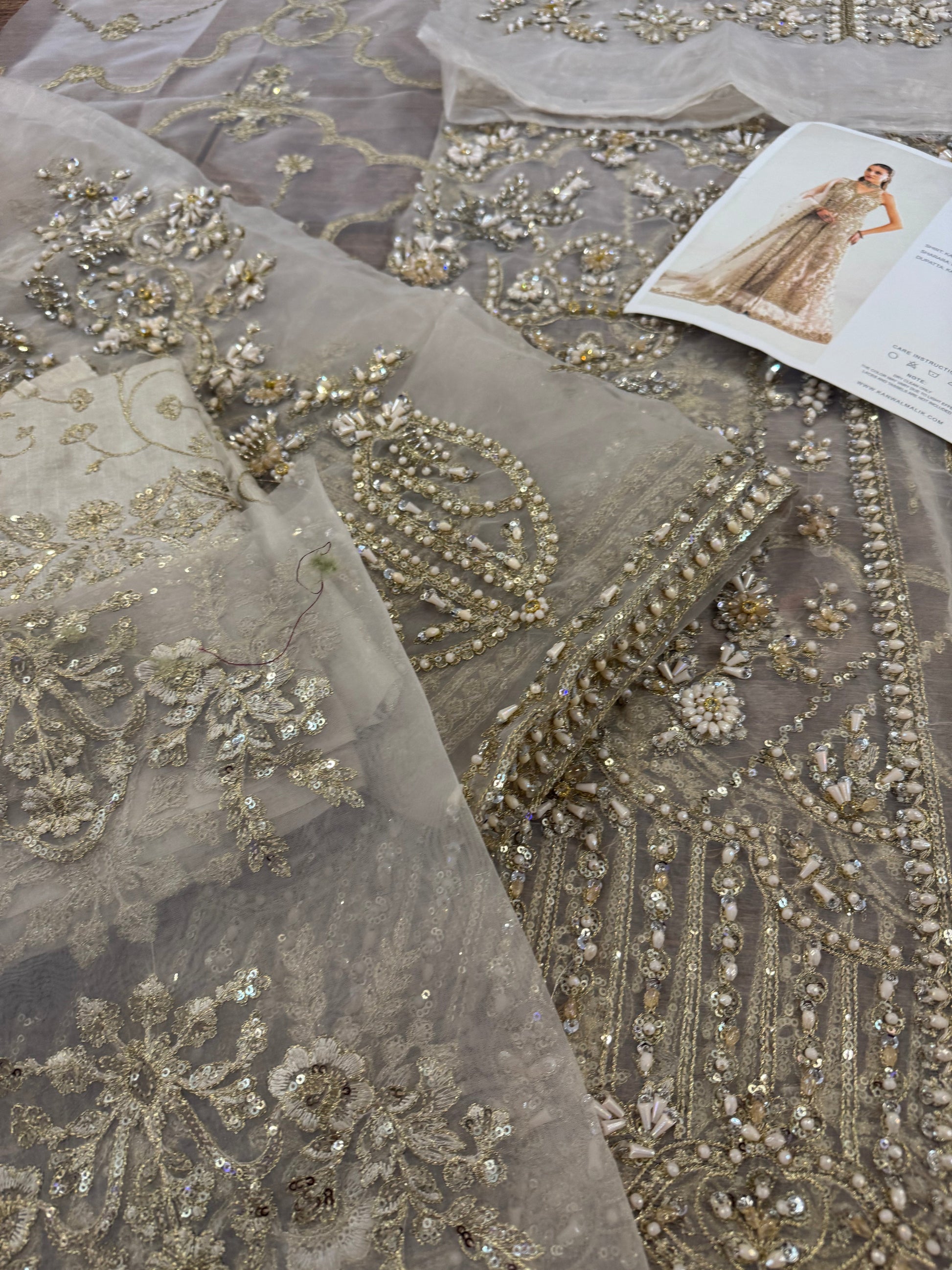 This elegant ivory ensemble features a straight shirt with a front open slit, paired with a sharara and dupatta. The shirt, crafted from luxurious Kathan organza, is meticulously hand-embellished with a dazzling array of sequins, crystals, naqshi, and dabka, creating a radiant and intricate design. It is beautifully complemented by a lawn silk sharara that adds a touch of richness and flow. The look is completed with a Kathan organza dupatta, adorned with a mesmerizing spray of sequins that enhances its ethereal charm. This ensemble is perfect for making a sophisticated and unforgettable statement at any special occasion.