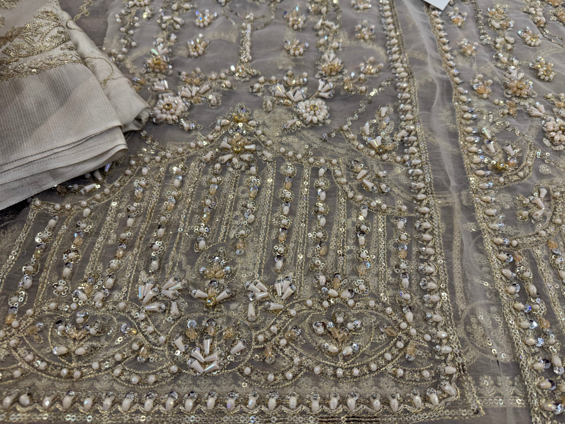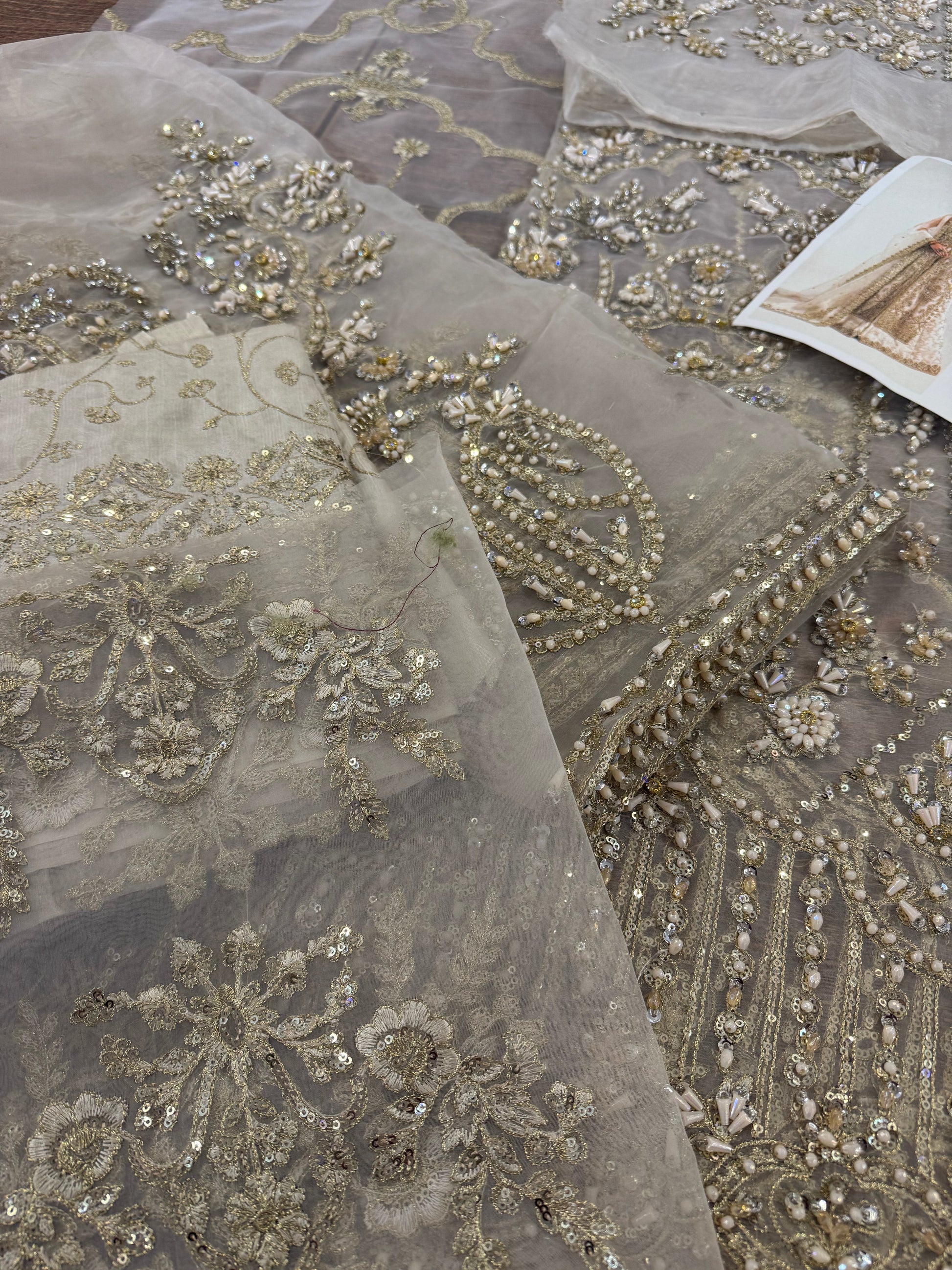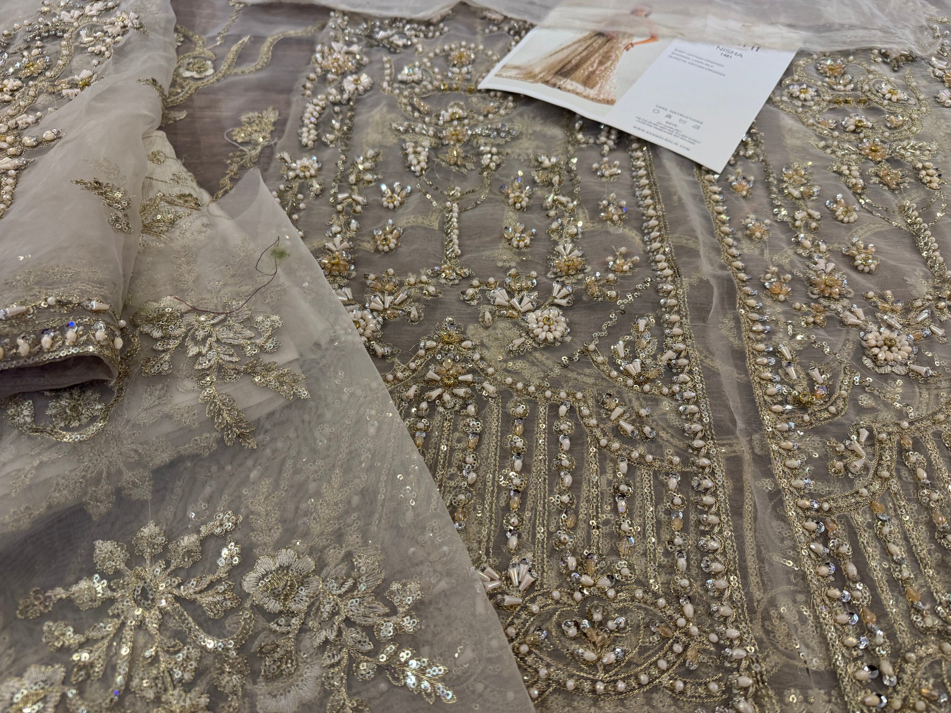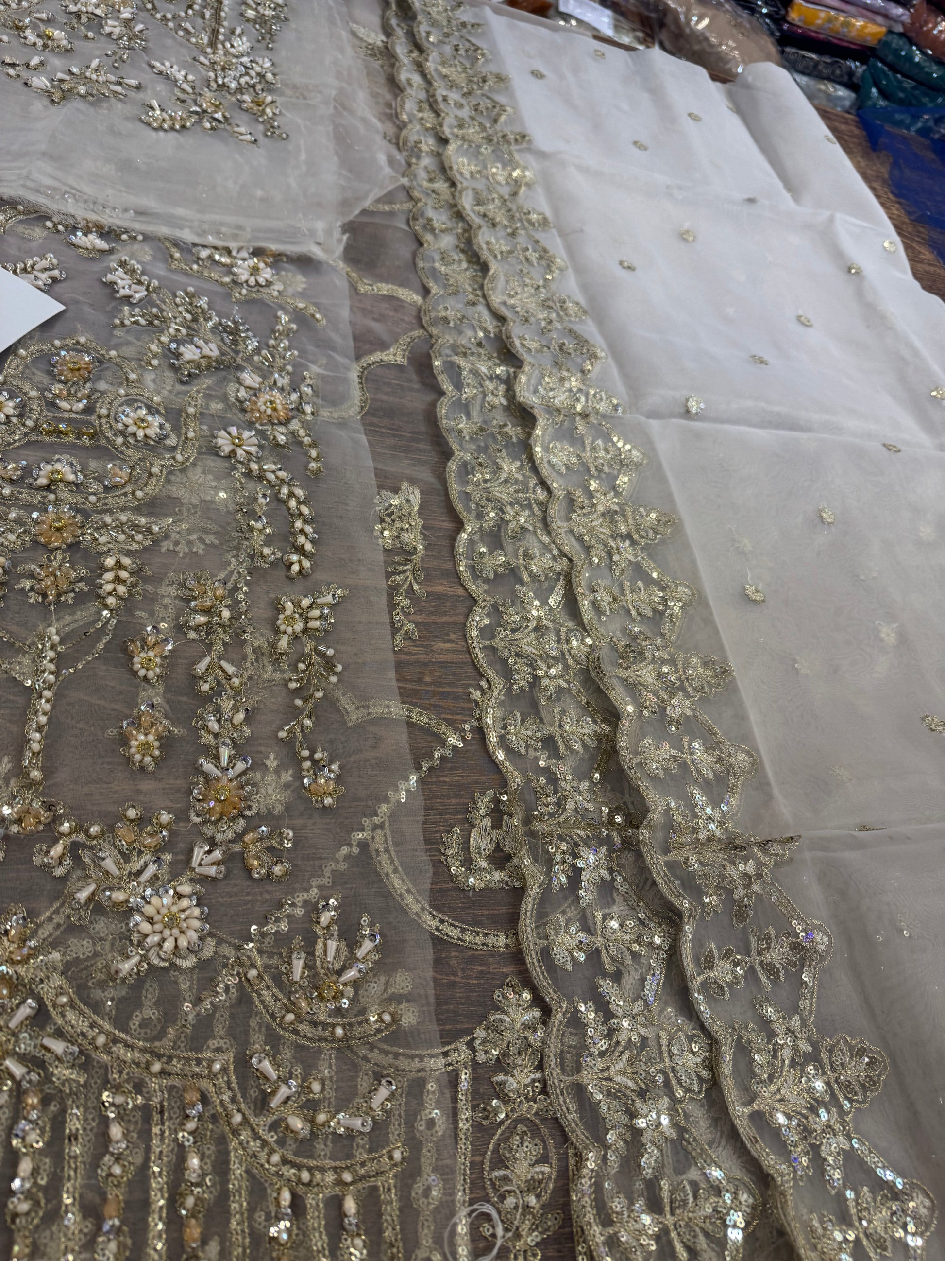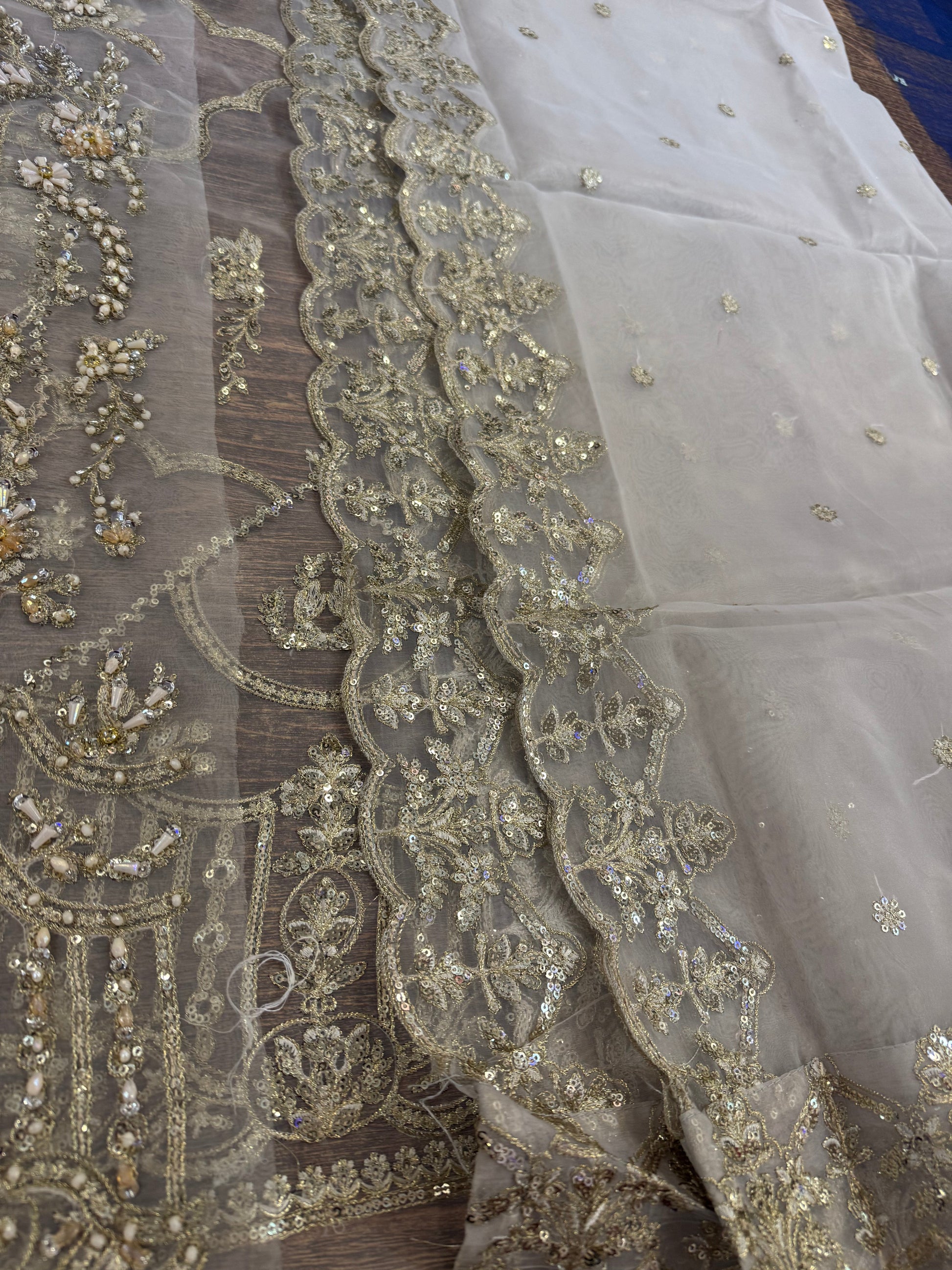 This elegant ivory ensemble features a straight shirt with a front open slit, paired with a sharara and dupatta. The shirt, crafted from luxurious Kathan organza, is meticulously hand-embellished with a dazzling array of sequins, crystals, naqshi, and dabka, creating a radiant and intricate design. It is beautifully complemented by a lawn silk sharara that adds a touch of richness and flow. The look is completed with a Kathan organza dupatta, adorned with a mesmerizing spray of sequins that enhances its ethereal charm. This ensemble is perfect for making a sophisticated and unforgettable statement at any special occasion.