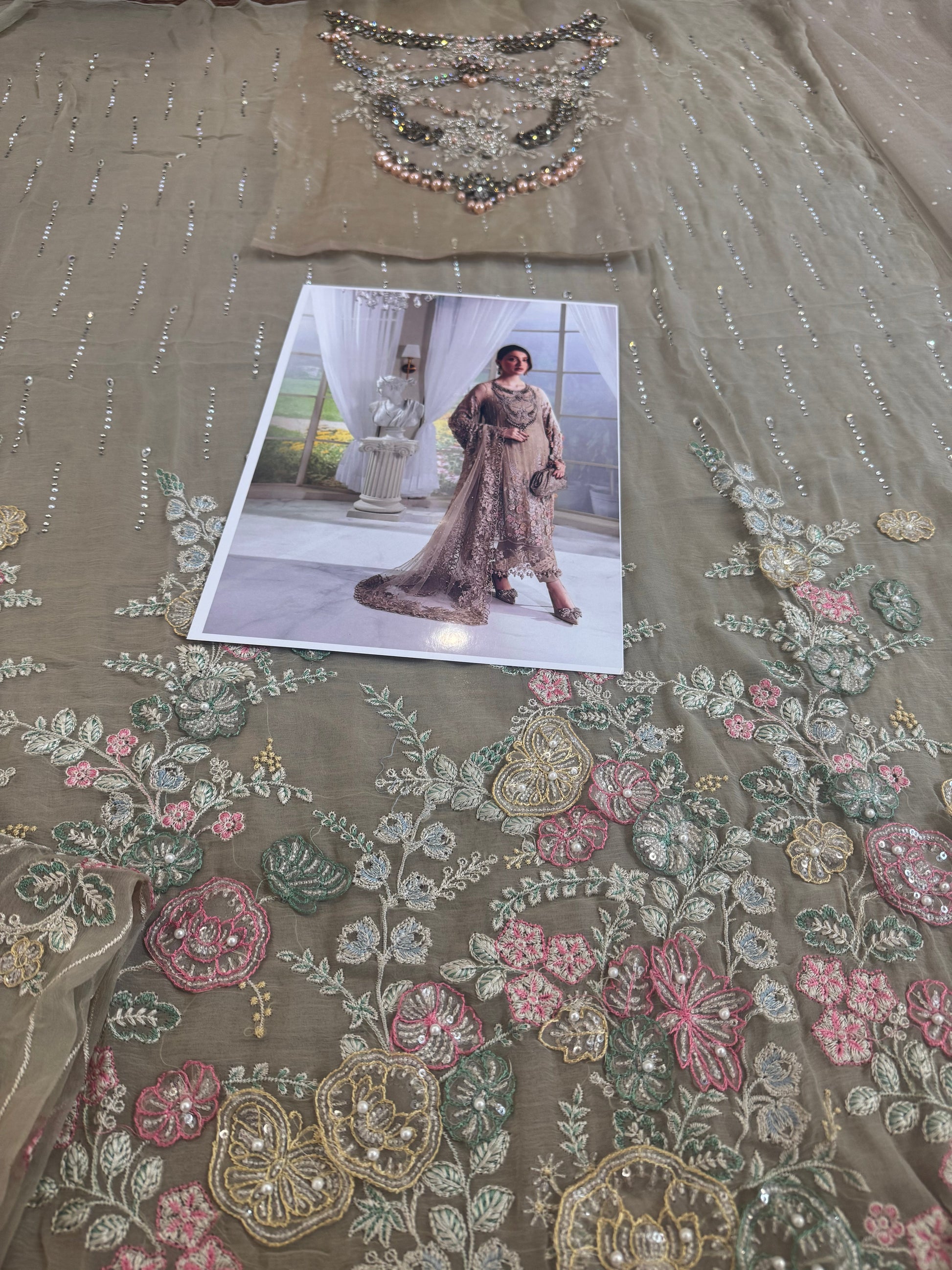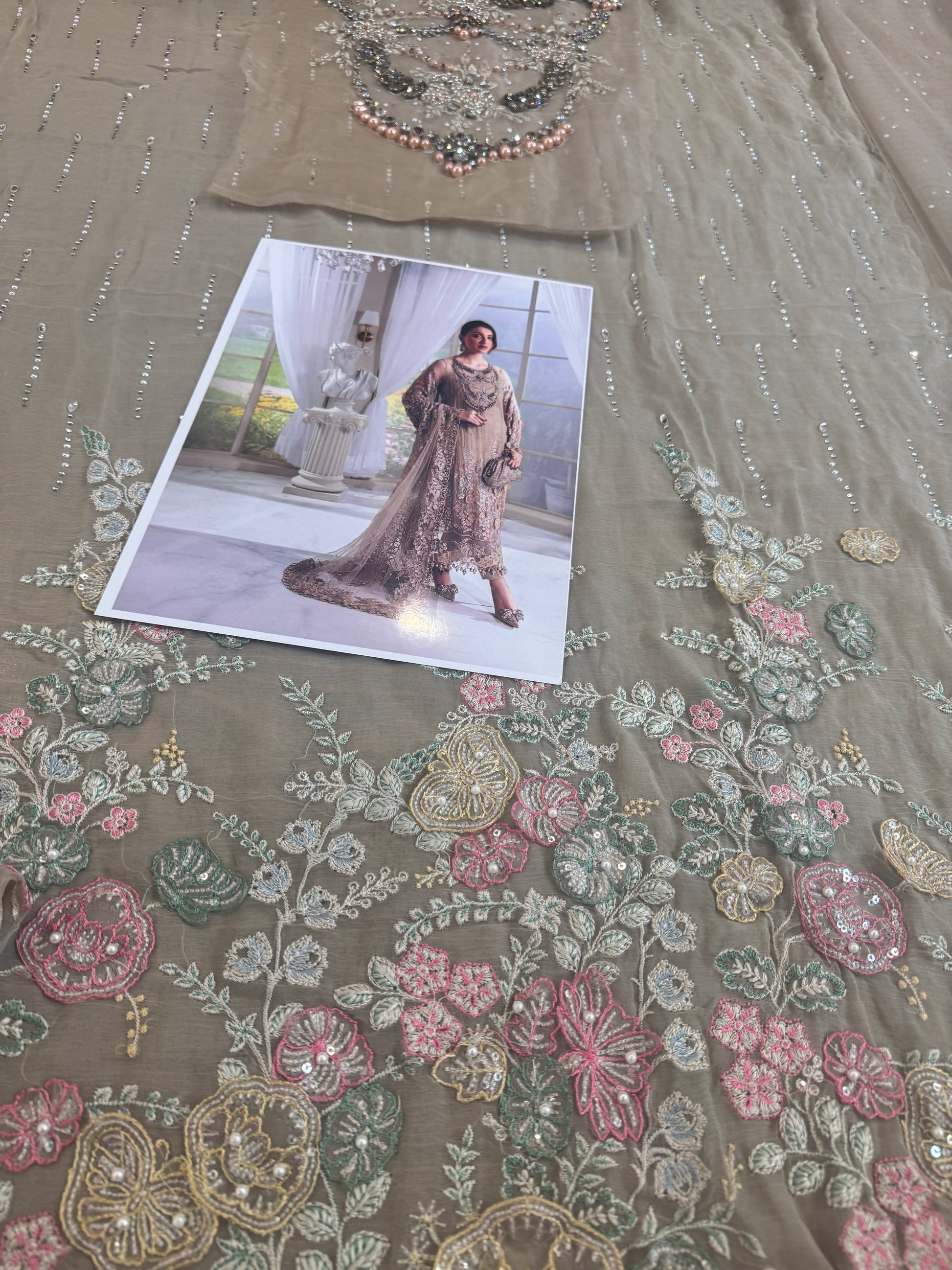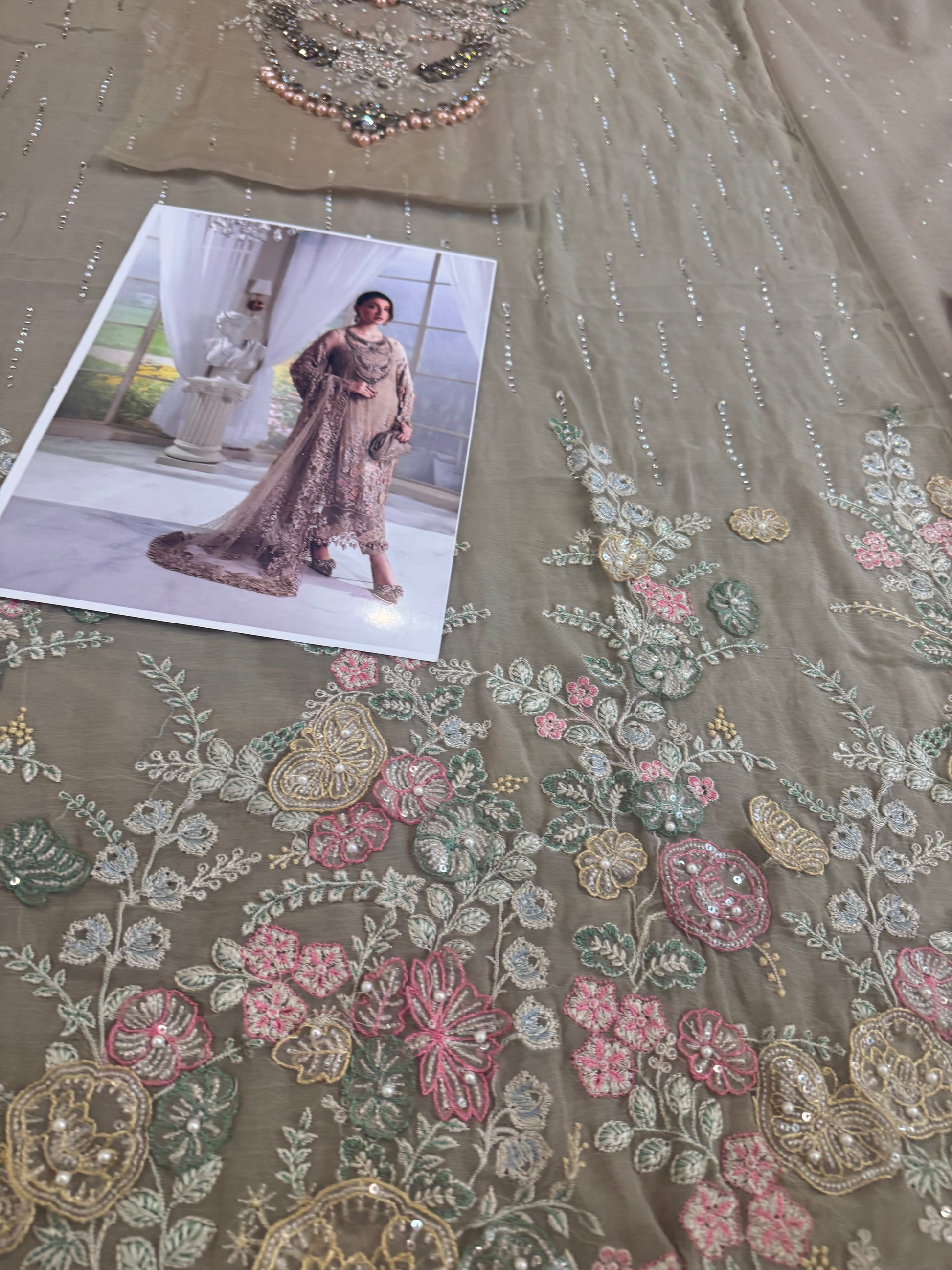 This exquisite bridal ensemble from Maria B's Wedding Edition is a Chiffon bridal outfit in a beautiful skin-toned hue. The three-piece unstitched suit features a heavily embellished front, sleeves, and dupatta with intricate handwork including diamantes, 3D flowers, and other delicate details. The dress showcases the brand's signature fusion of traditional Pakistani designs with contemporary elegance, making it a perfect choice for wedding ceremonies or formal events. The detailed craftsmanship is a hallmark of Maria B's luxury collection