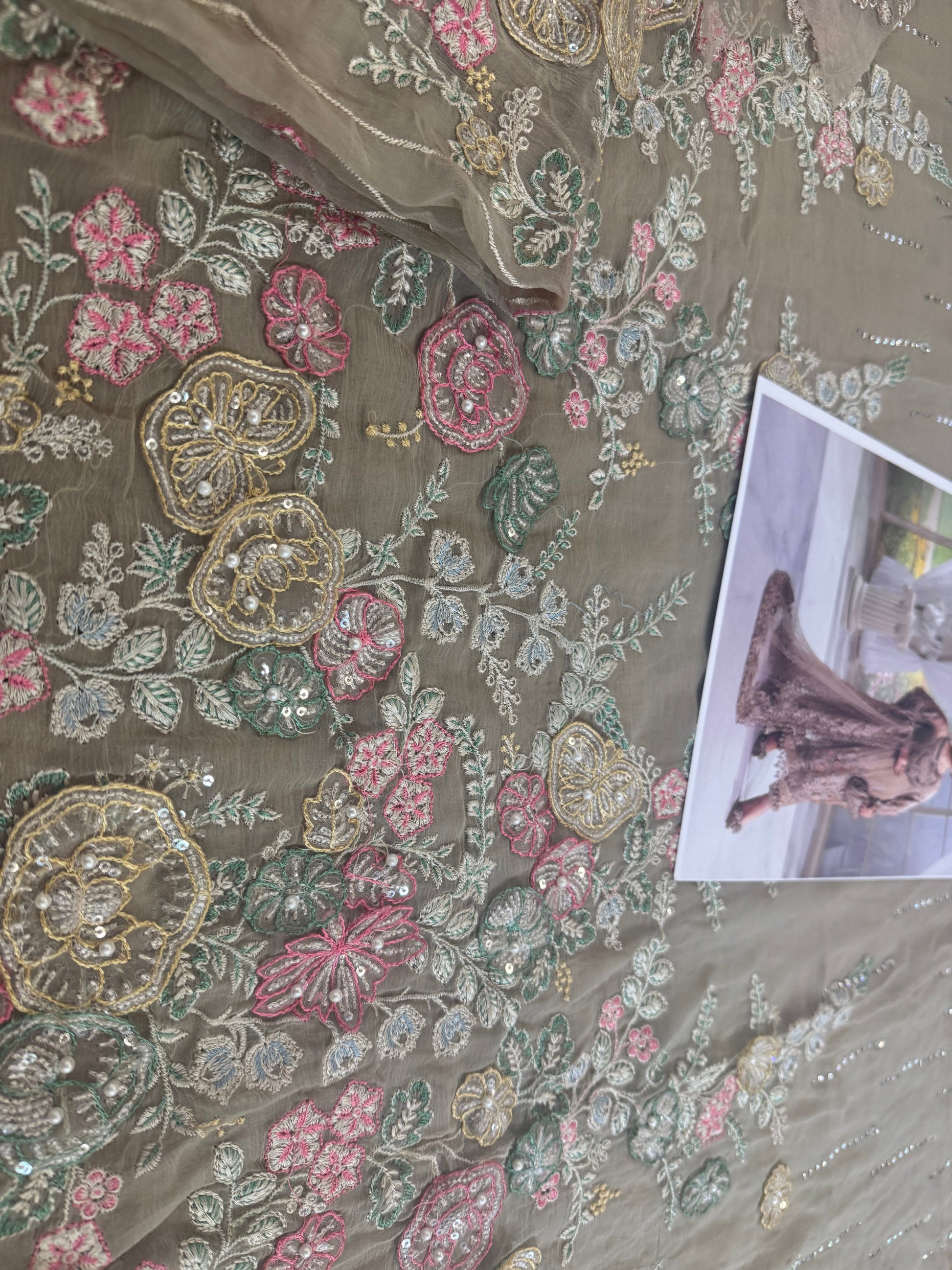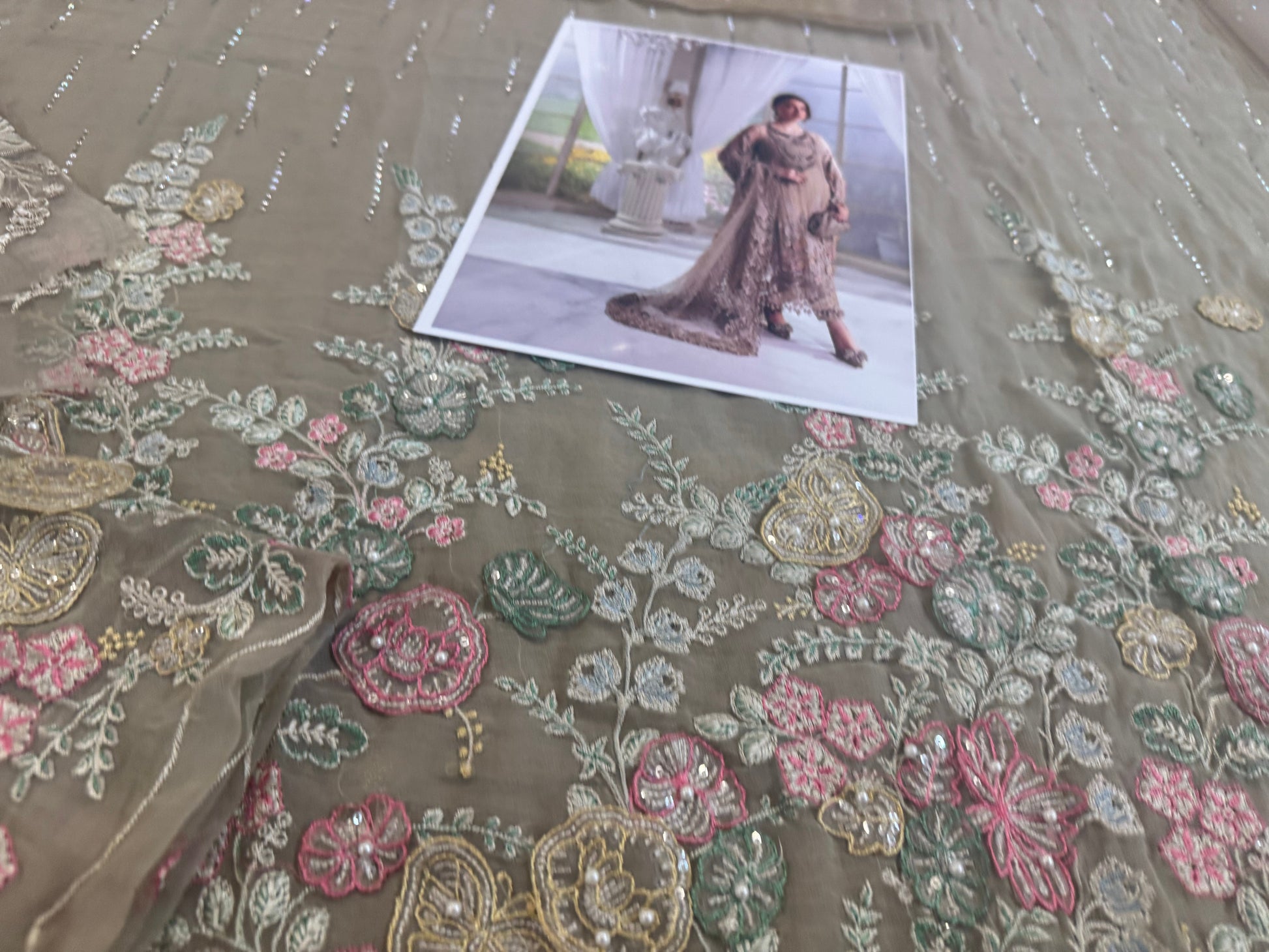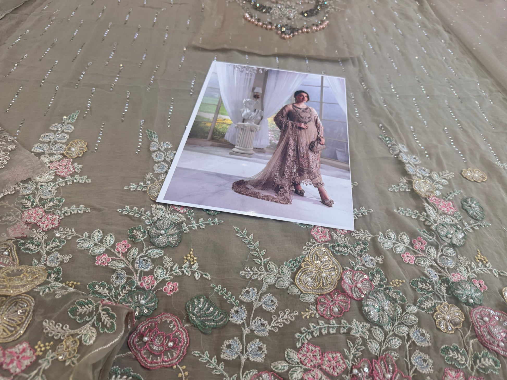 This exquisite bridal ensemble from Maria B's Wedding Edition is a Chiffon bridal outfit in a beautiful skin-toned hue. The three-piece unstitched suit features a heavily embellished front, sleeves, and dupatta with intricate handwork including diamantes, 3D flowers, and other delicate details. The dress showcases the brand's signature fusion of traditional Pakistani designs with contemporary elegance, making it a perfect choice for wedding ceremonies or formal events. The detailed craftsmanship is a hallmark of Maria B's luxury collection