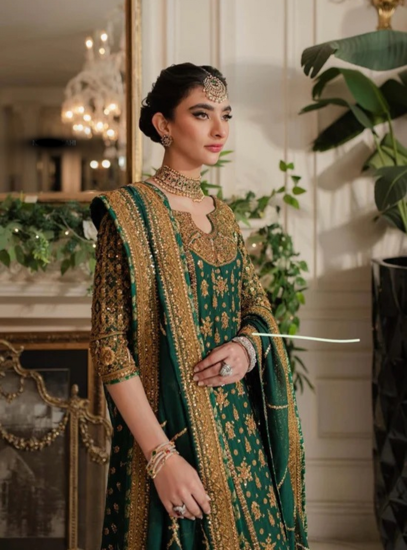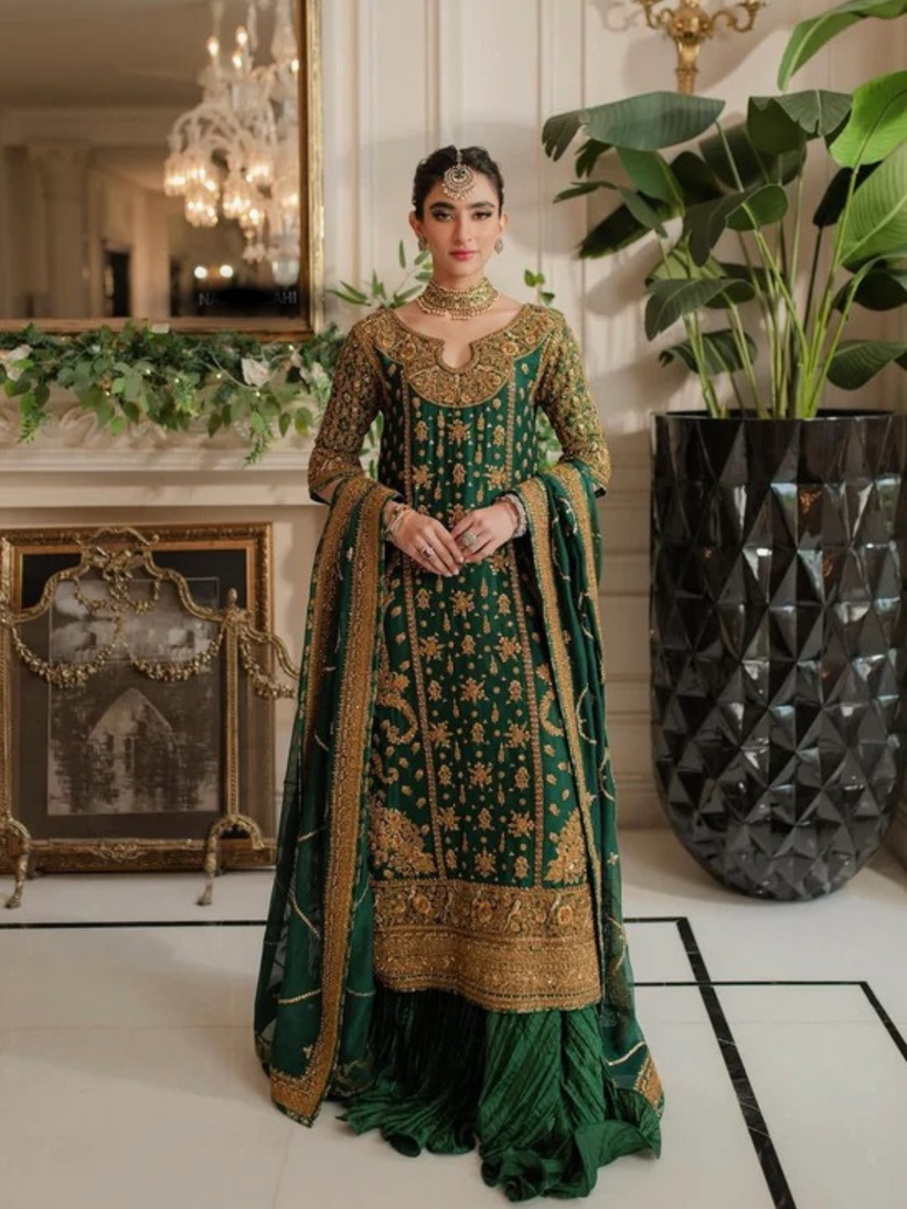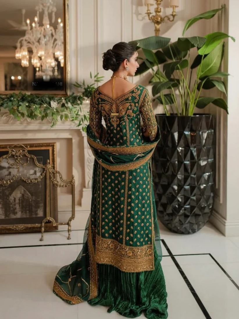 Mehrunissa by Nadia Ellahi” is an opulent ensemble that embodies regal charm and timeless sophistication. Designed with meticulous attention to detail, it features exquisite hand embroidery, intricate embellishments, and luxurious fabrics that drape gracefully. The ensemble’s rich color palette and delicate craftsmanship reflect a perfect fusion of tradition and modern elegance, making it an ideal choice for those who seek refinement and grandeur.