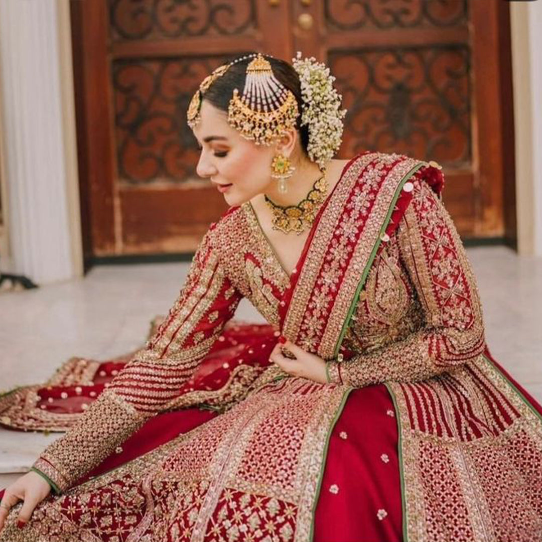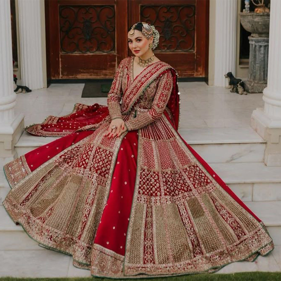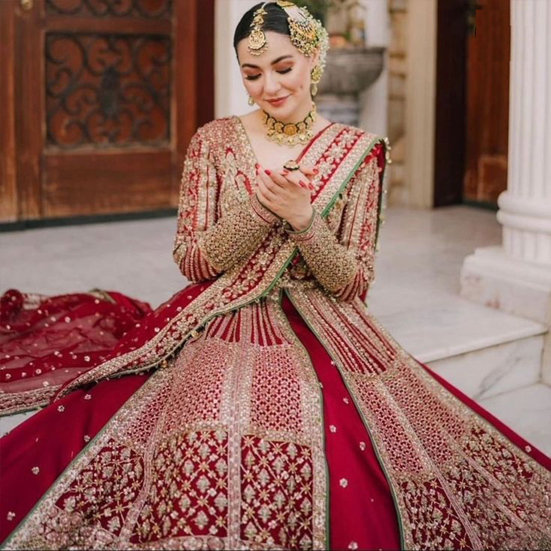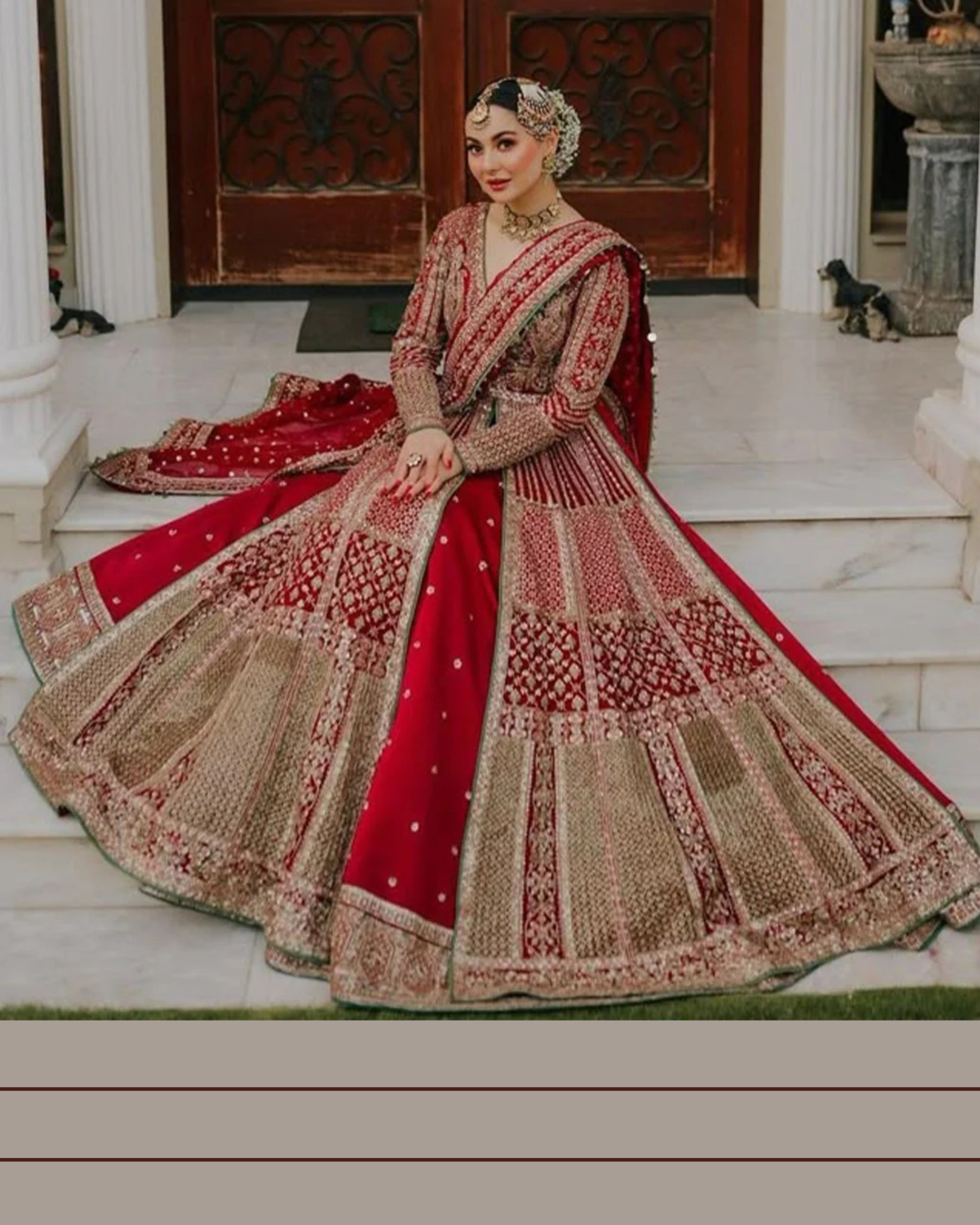 This ravishing bridal outfit is rendered in a beautiful shade of berry red composed on an organza front open peshwas with an intricate and exquisite detailed adda work of sequins, Buggle beads, resham, nakshi and dabka makes truely an artwork. Lehnga feautures all over handwork chatta and a detailed border enhanced with nakshi and stonework. To complete the look paired it with organza duppata composed of heavy chatta in the middle and heavy embellished four side border finished with an accent color of sage green gives an ethnic regality.