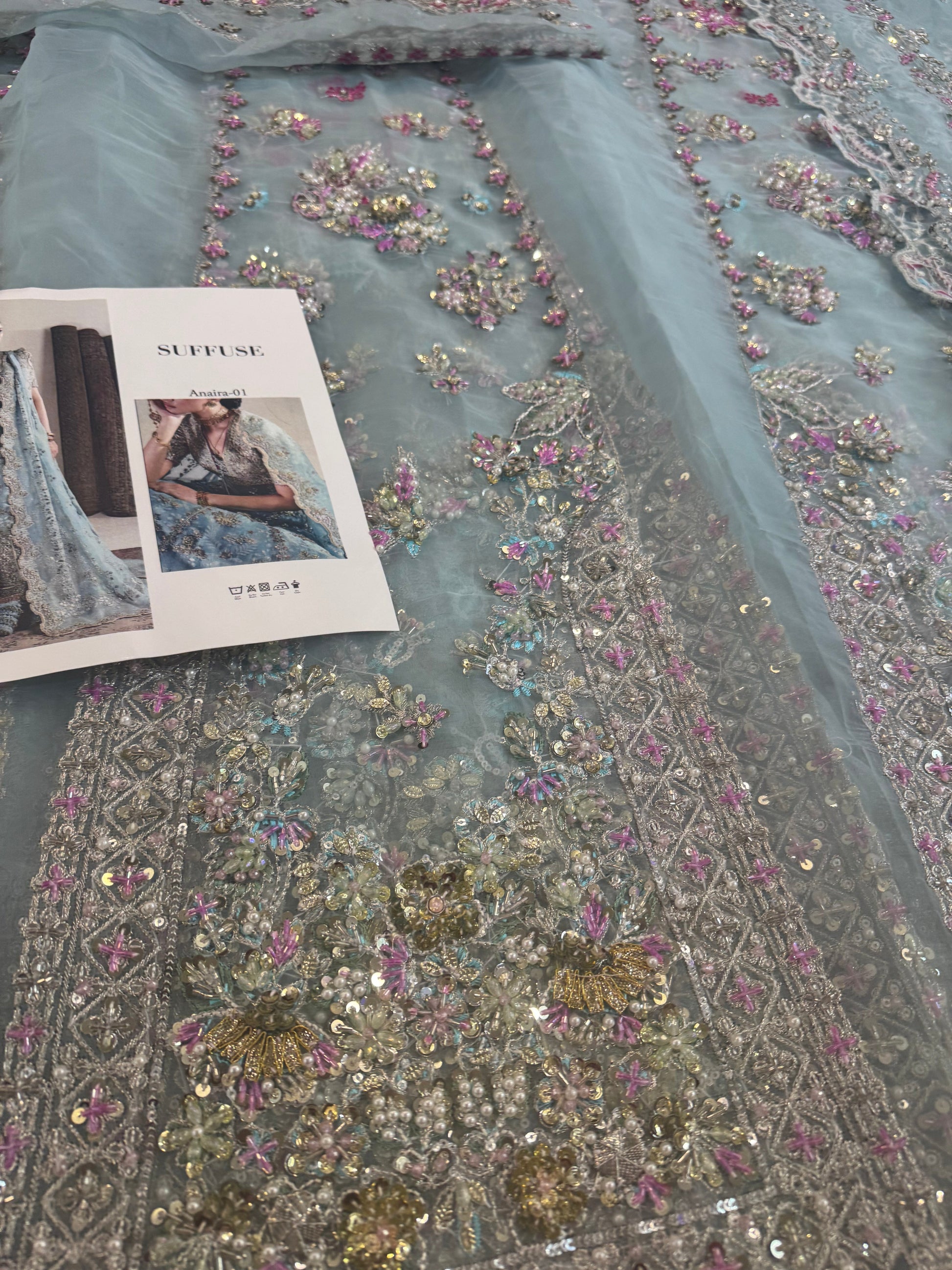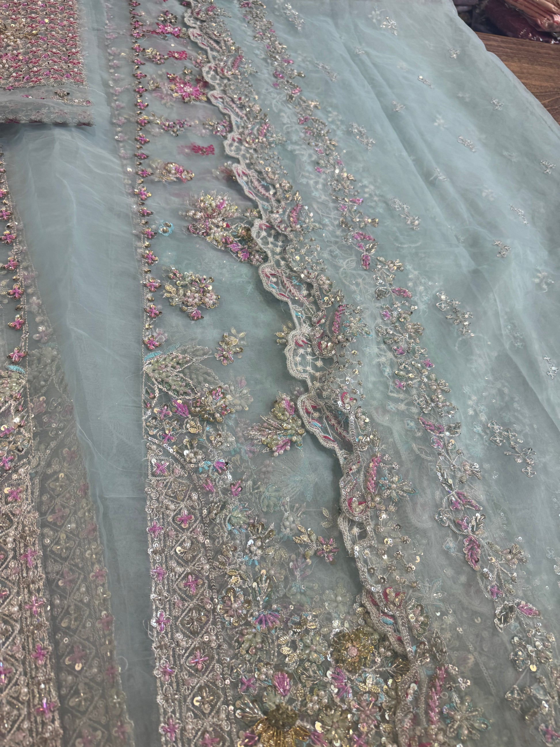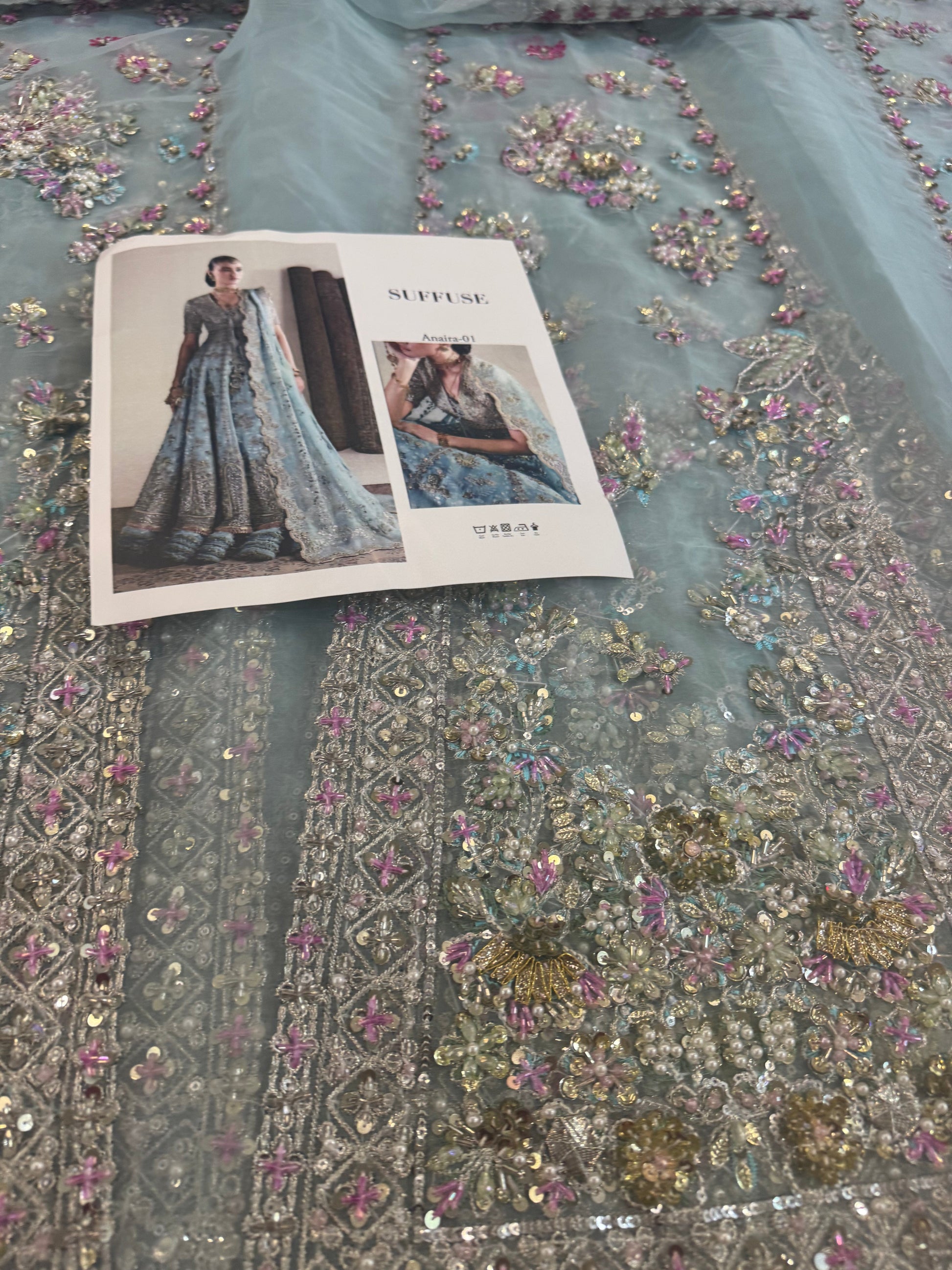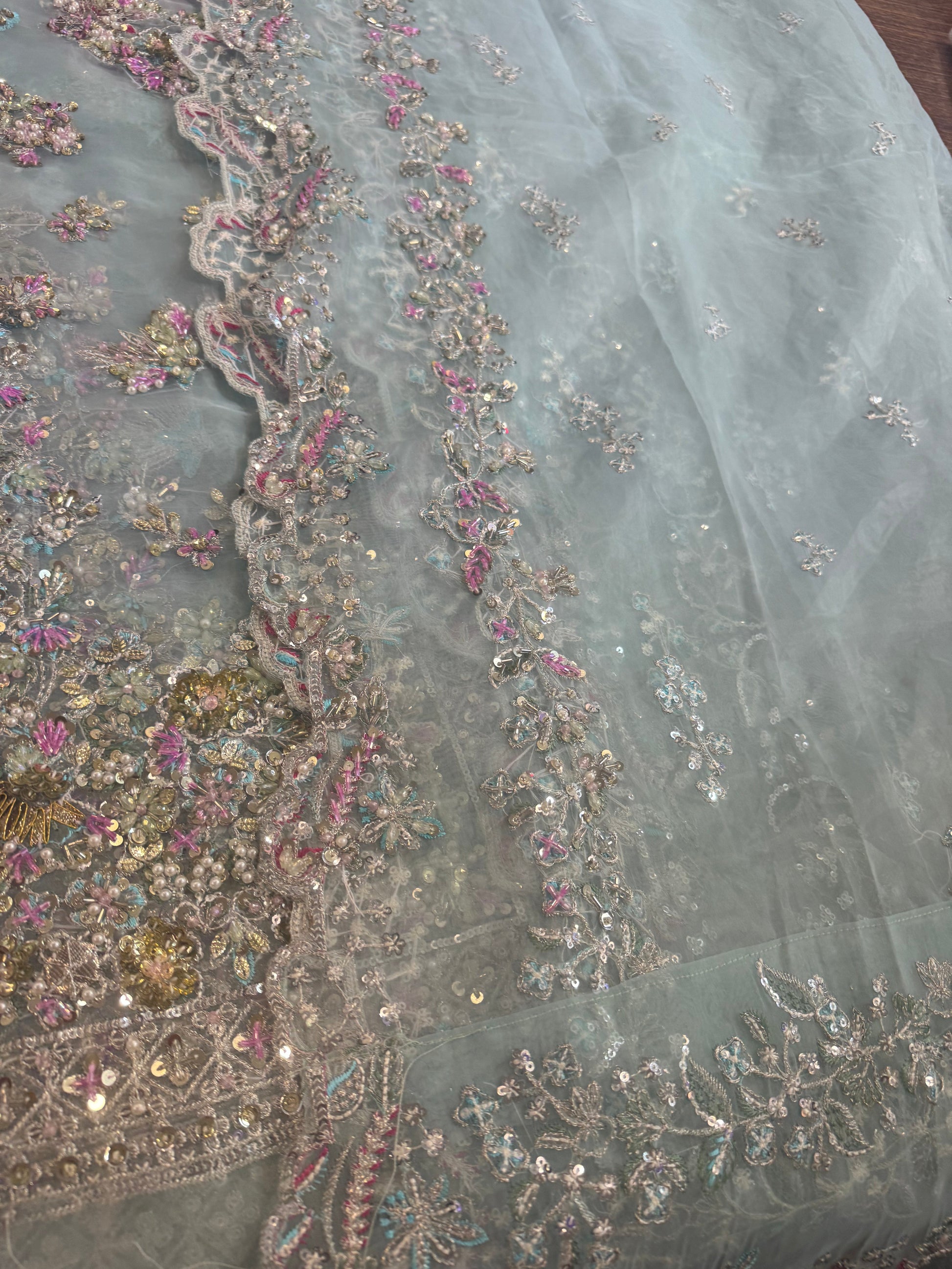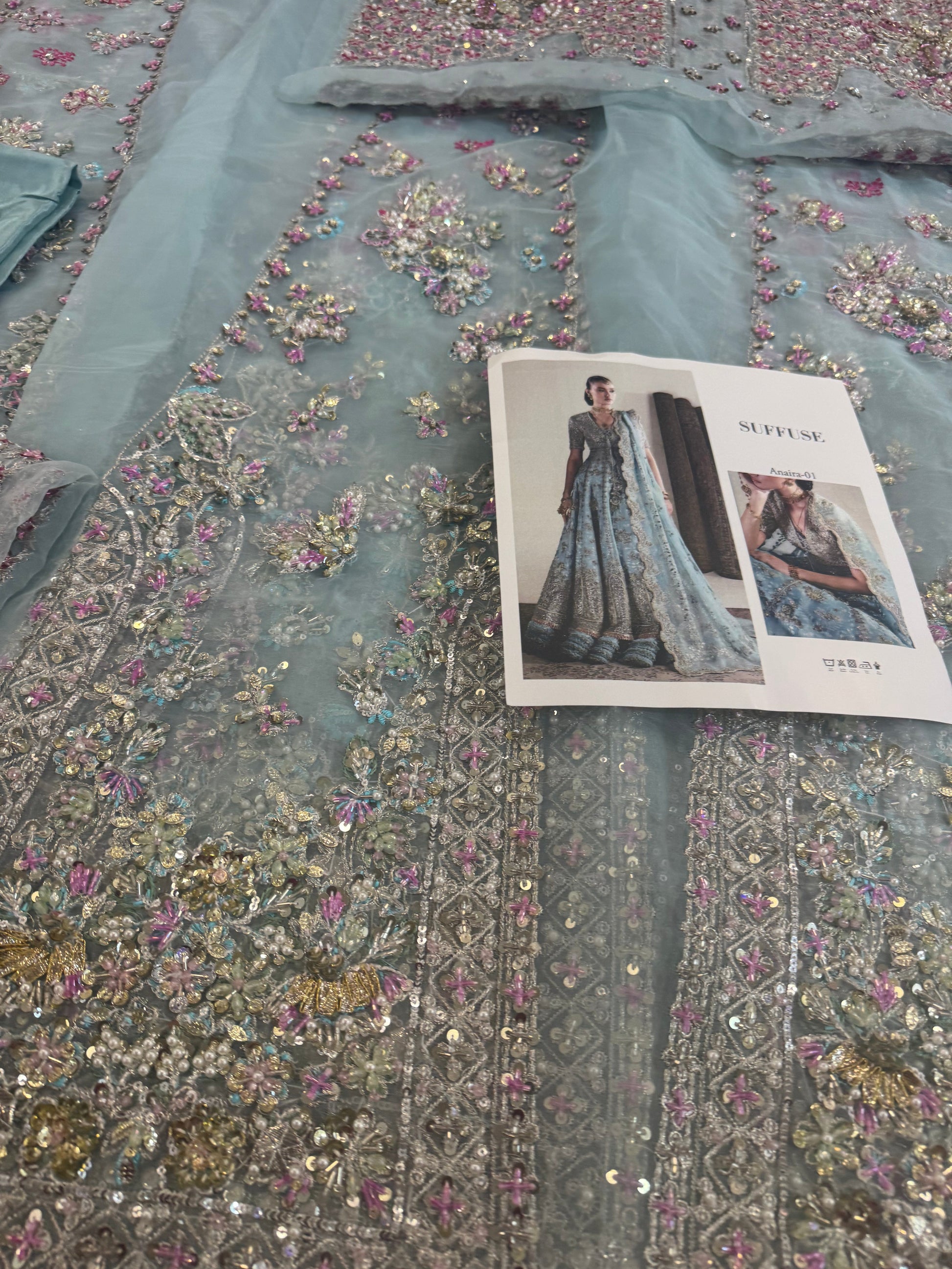 This stunning chiffon bridal lehenga from Suffuse by Sana Yasir, known as the 'Suffuse Sky,' is a breathtaking piece from their wedding edition. The ensemble features a sky-blue lehenga and choli meticulously embellished with intricate silver and gold embroidery, creating a dazzling and luxurious effect. The choli has a deep V-neck and short sleeves, while the voluminous lehenga is adorned with detailed floral and geometric patterns that shimmer with every movement. A matching dupatta, with a heavily embroidered border and scattered sequin work, drapes gracefully over the shoulder, completing the regal look.