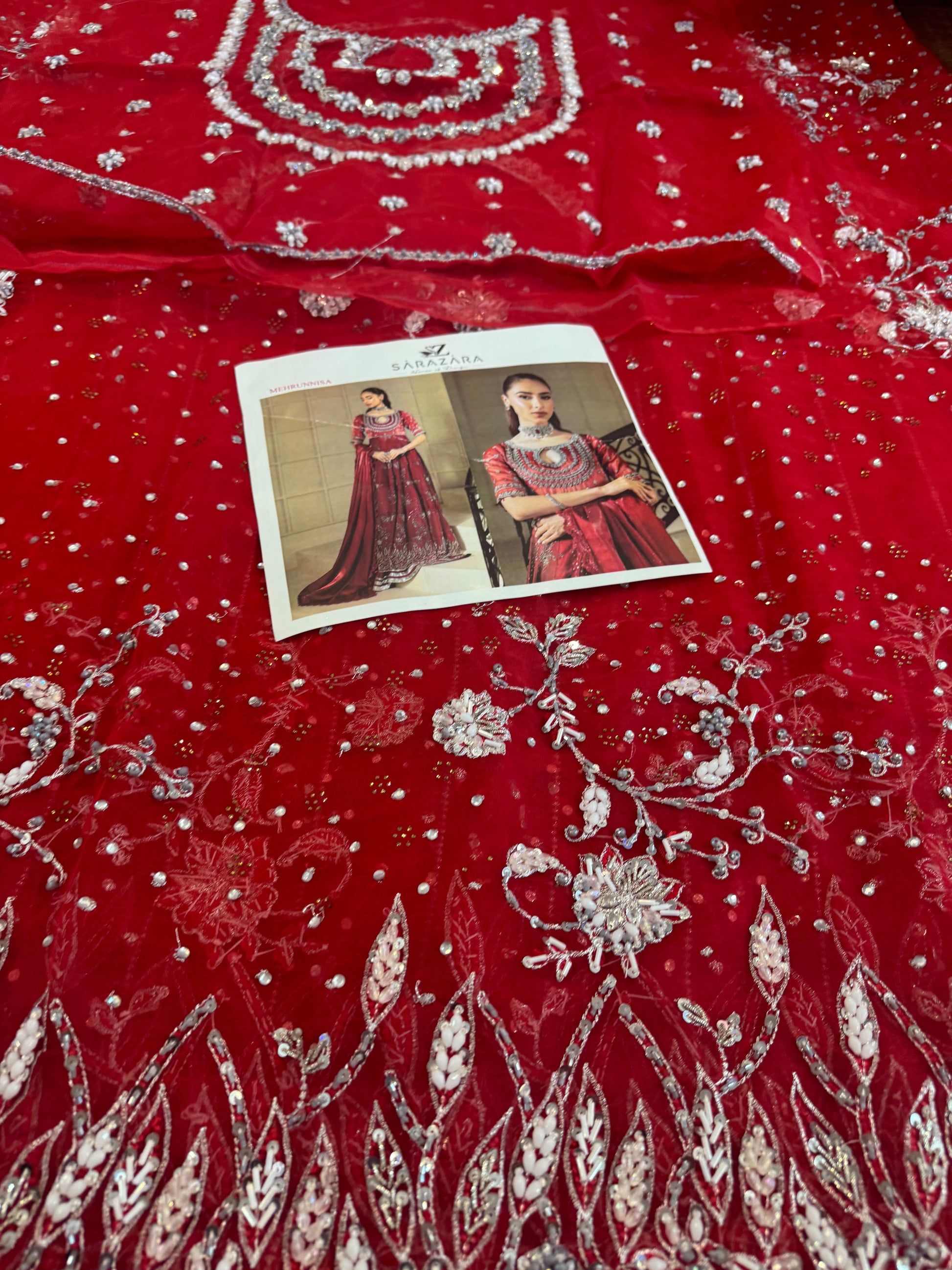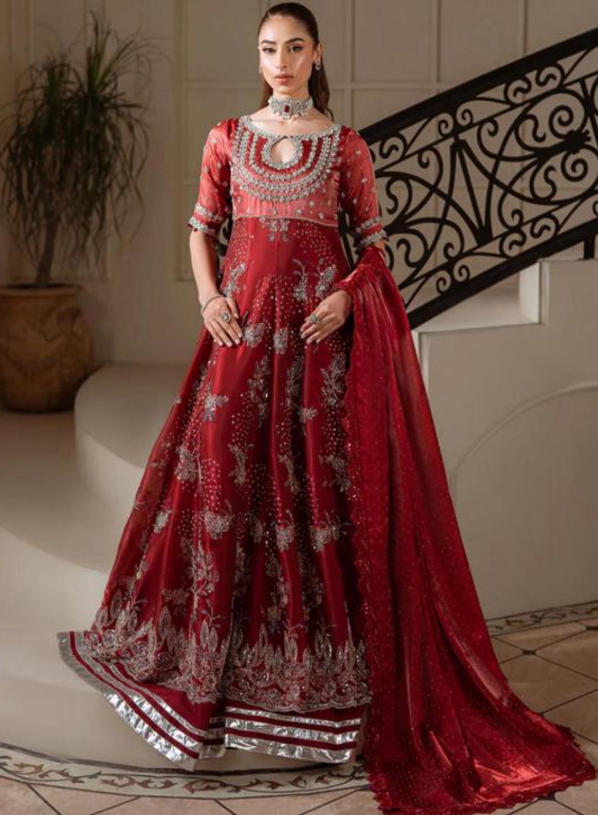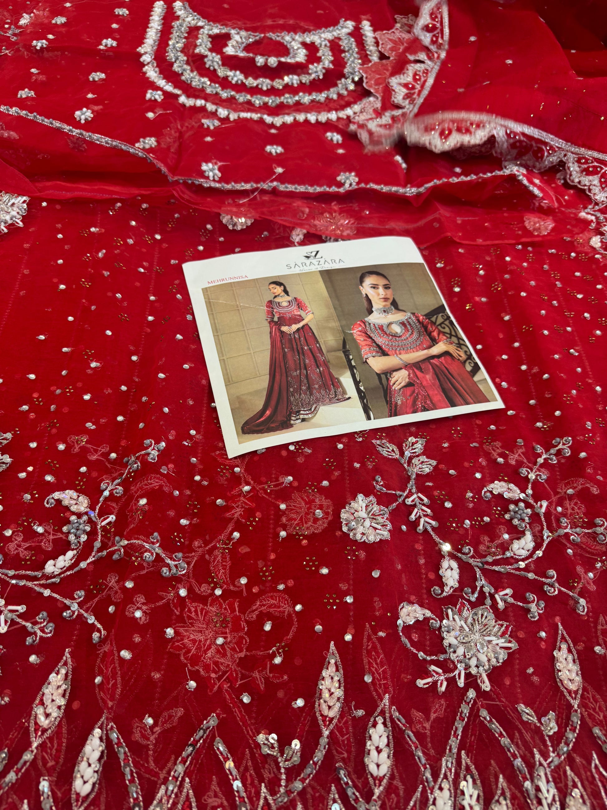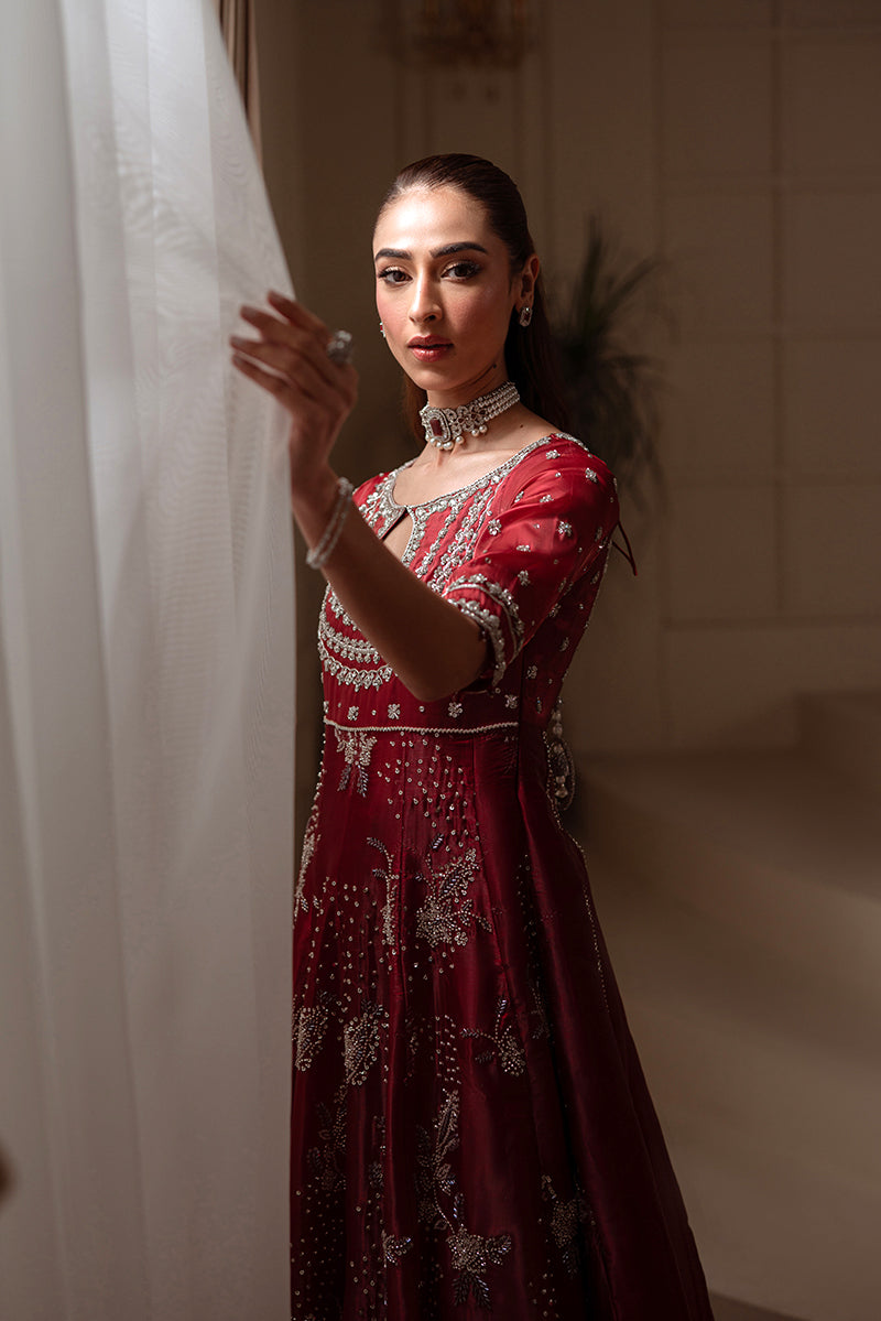 This deep merlot outfit embodies the regal elegance of Empress Mehrunnisa, capturing the significance of maroon in the Mughal royal court—a color reserved for nobility and those of high rank. Crafted from luxurious organza silk, the floor-lenght gown is hand-embellished with intricate zardozi, katdana, and sequins. The long, flowy silhouette is paired with raw silk flared sharara pants, while the dupatta glistens with moonlight stones, adding a touch of sparkle with every movement. A true representation of Mughal opulence and grace, this ensemble honors the Empress’s noble stature and timeless beauty.
