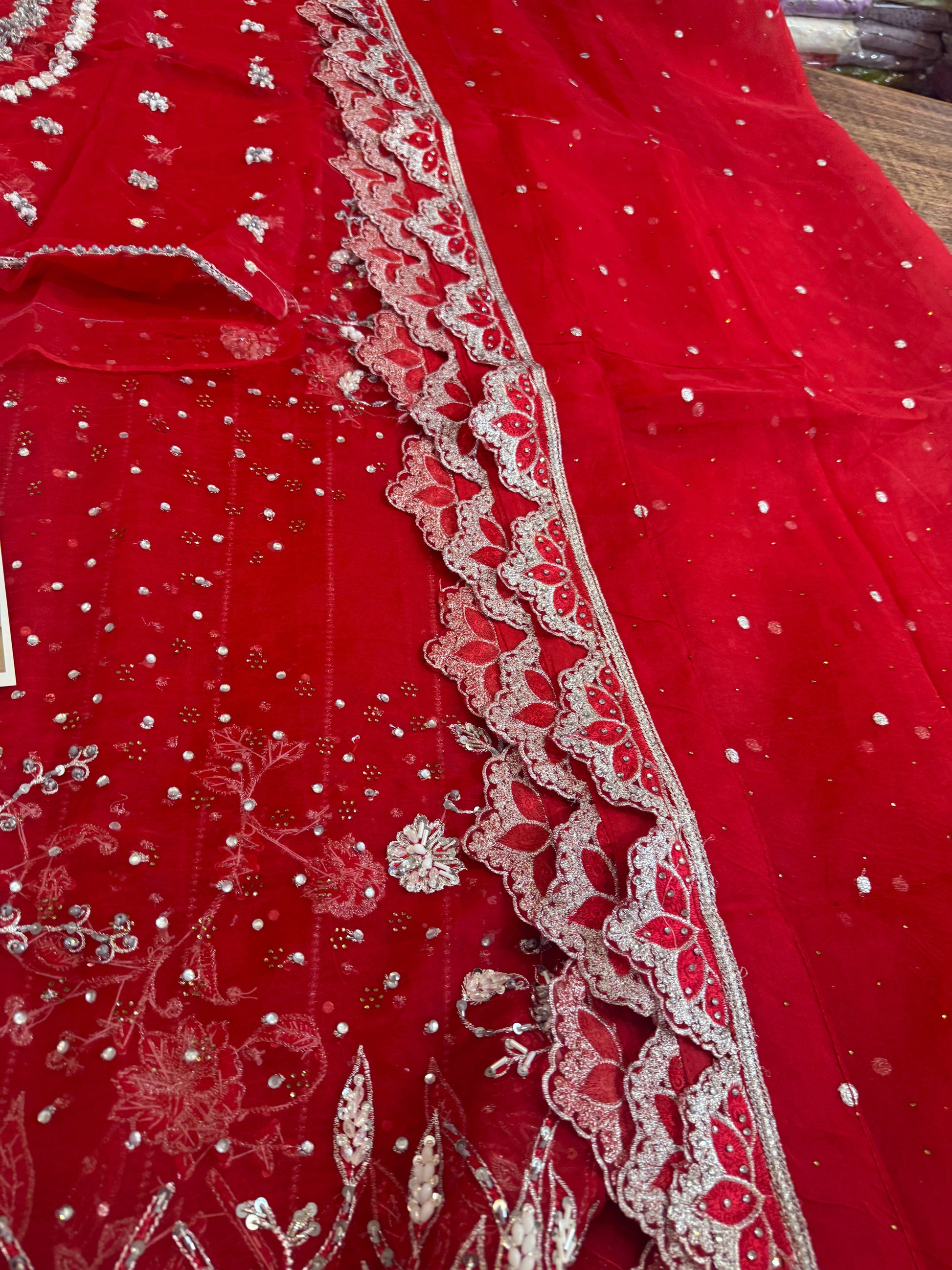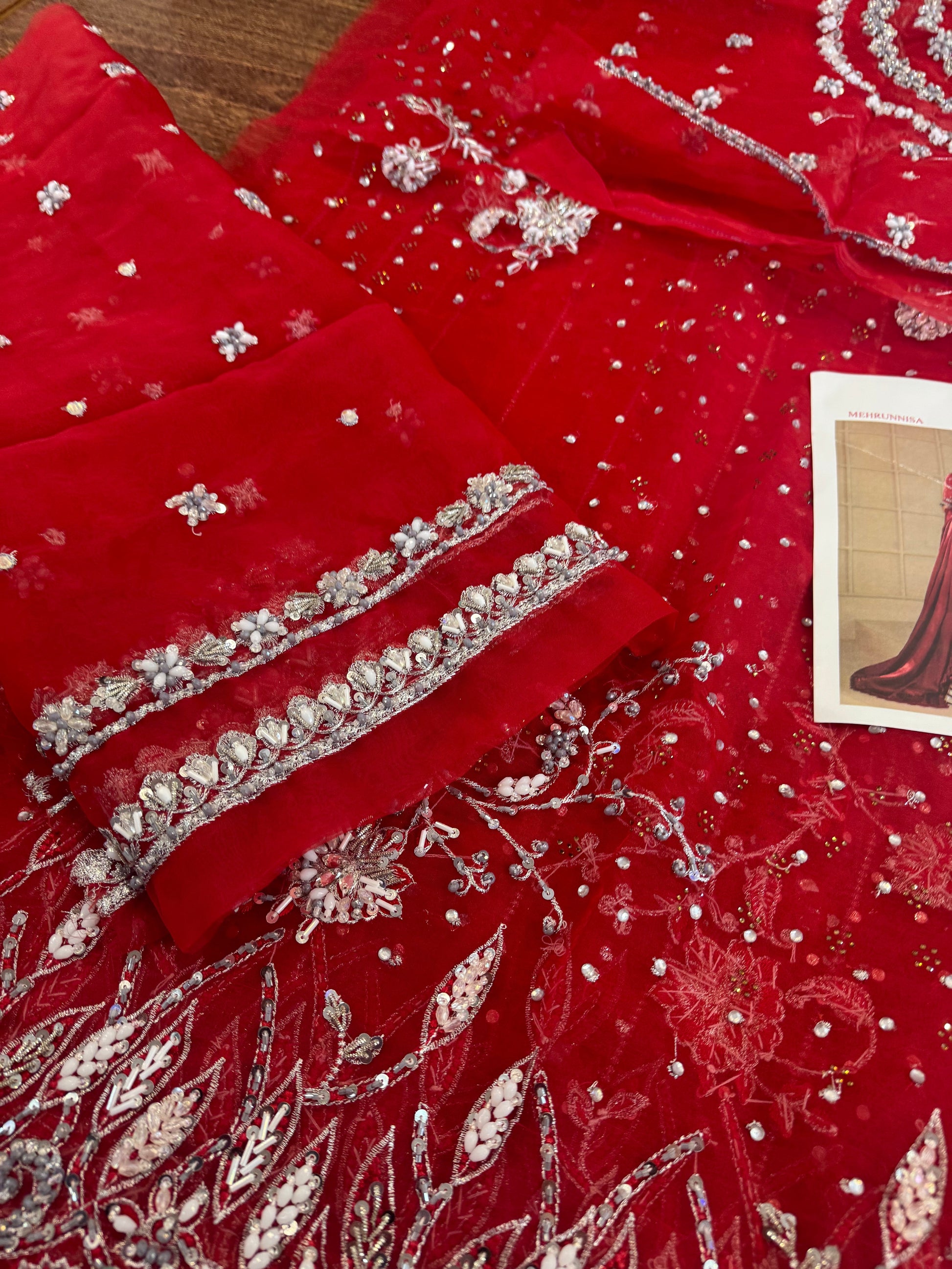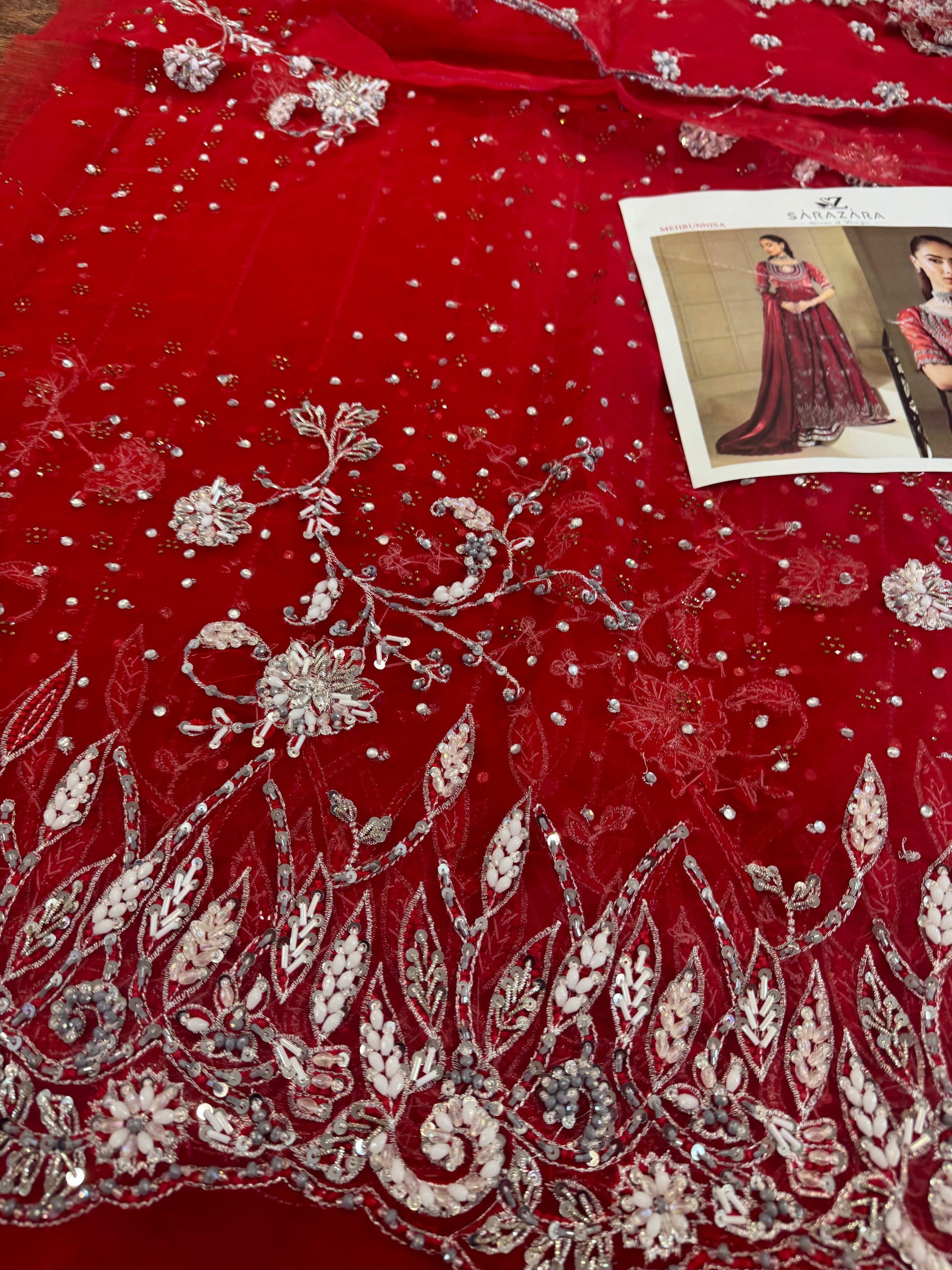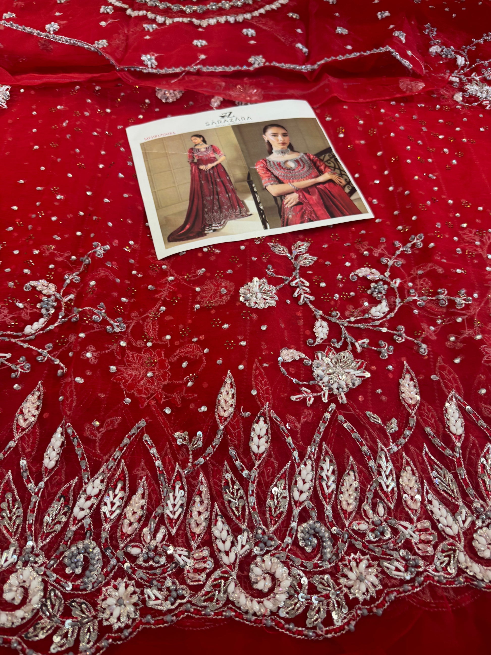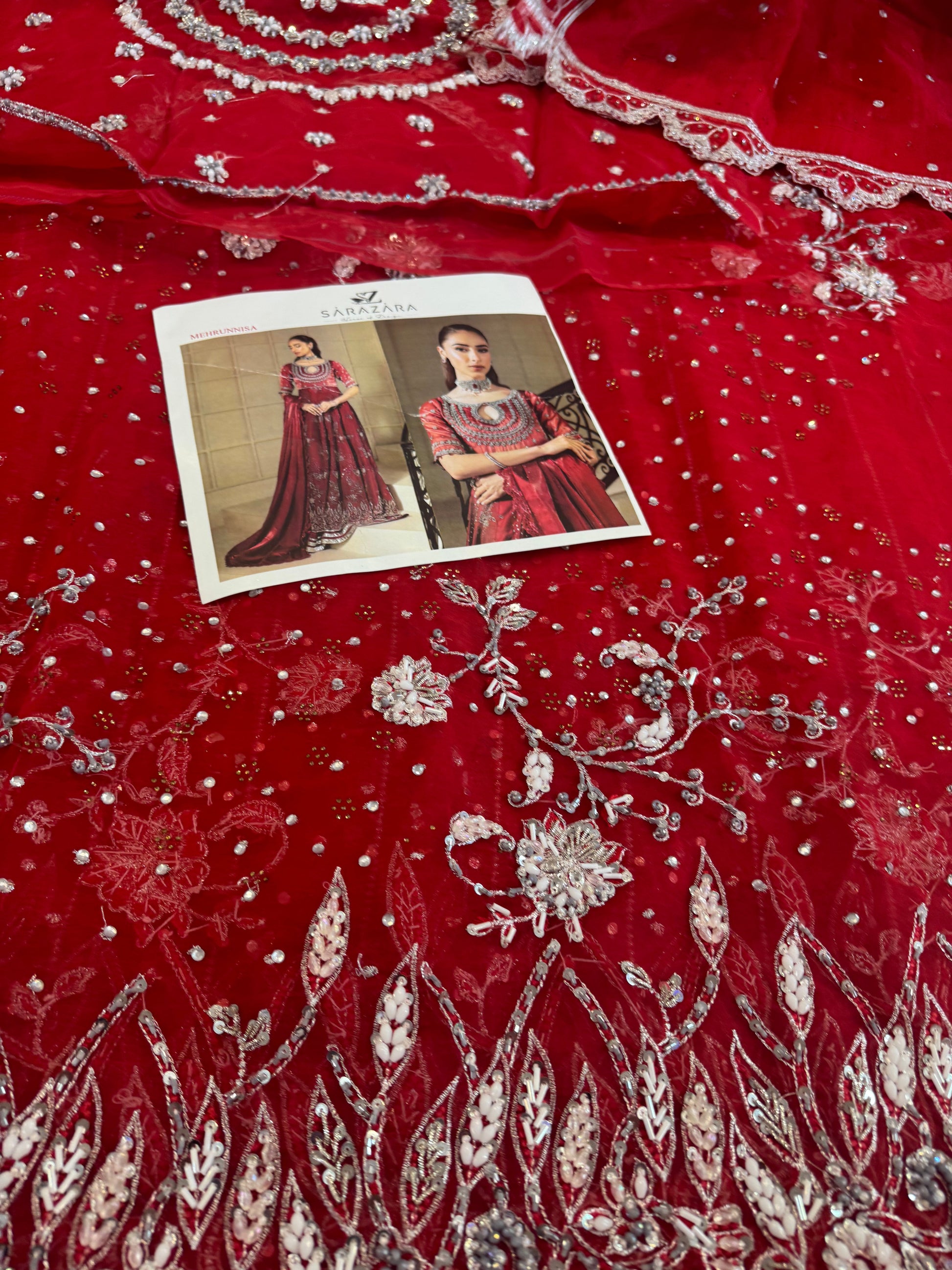 This deep merlot outfit embodies the regal elegance of Empress Mehrunnisa, capturing the significance of maroon in the Mughal royal court—a color reserved for nobility and those of high rank. Crafted from luxurious organza silk, the floor-lenght gown is hand-embellished with intricate zardozi, katdana, and sequins. The long, flowy silhouette is paired with raw silk flared sharara pants, while the dupatta glistens with moonlight stones, adding a touch of sparkle with every movement. A true representation of Mughal opulence and grace, this ensemble honors the Empress’s noble stature and timeless beauty.