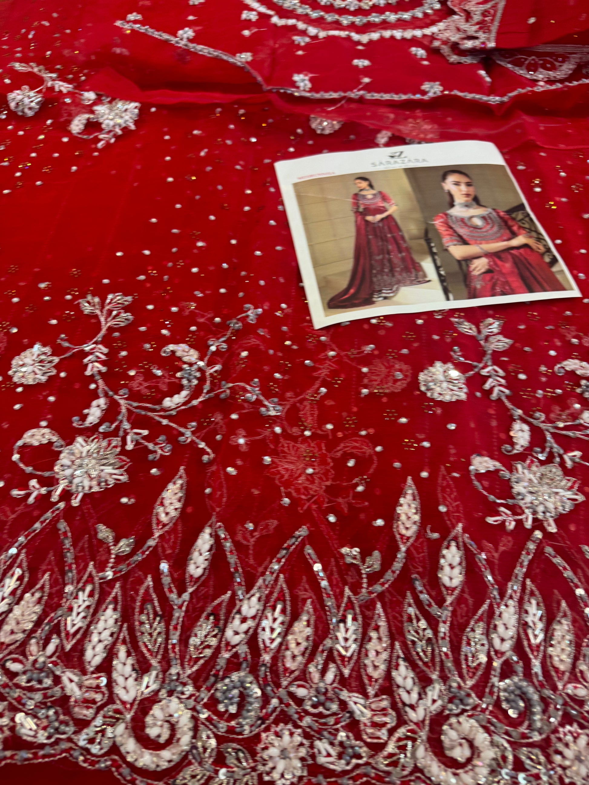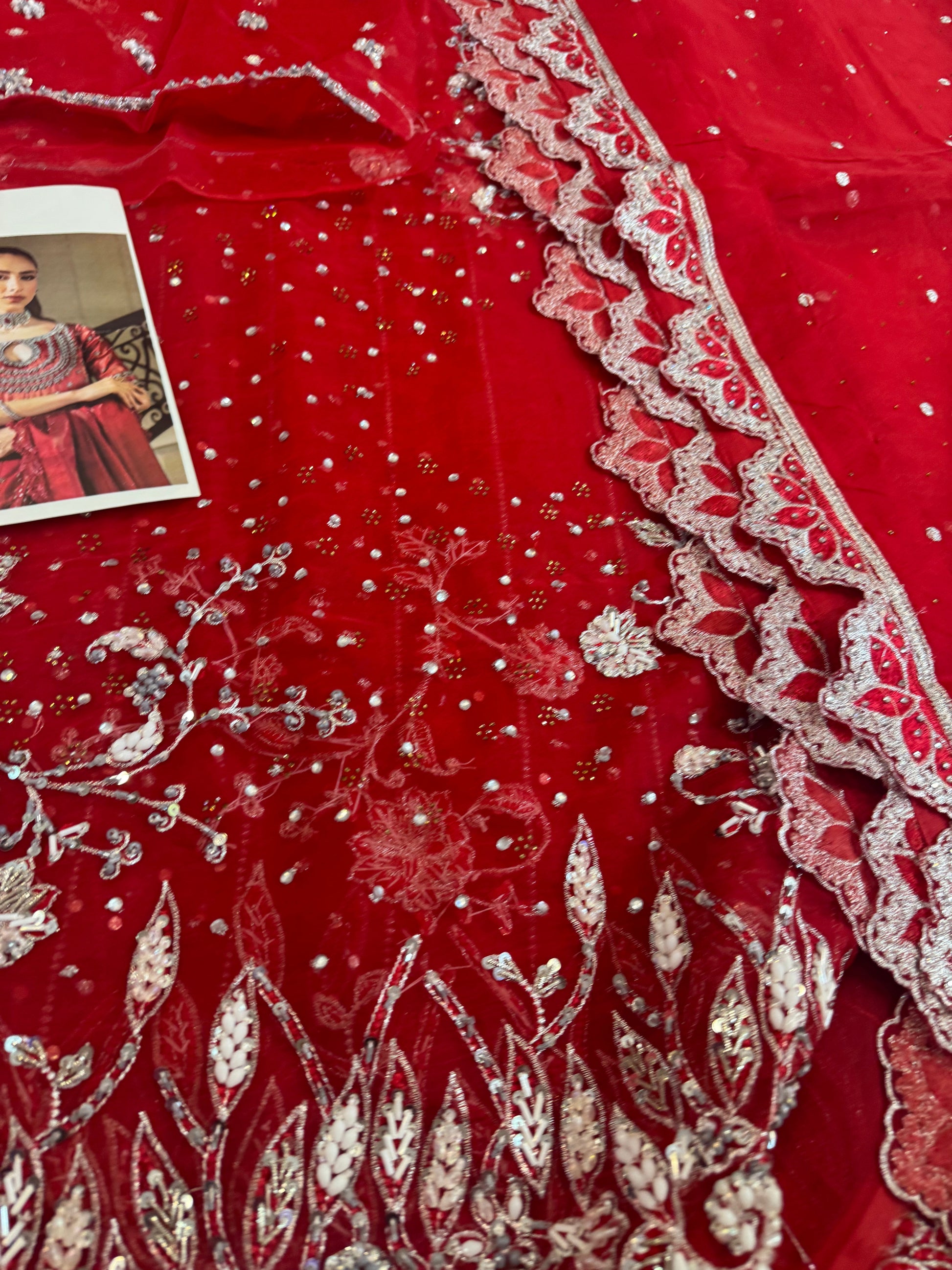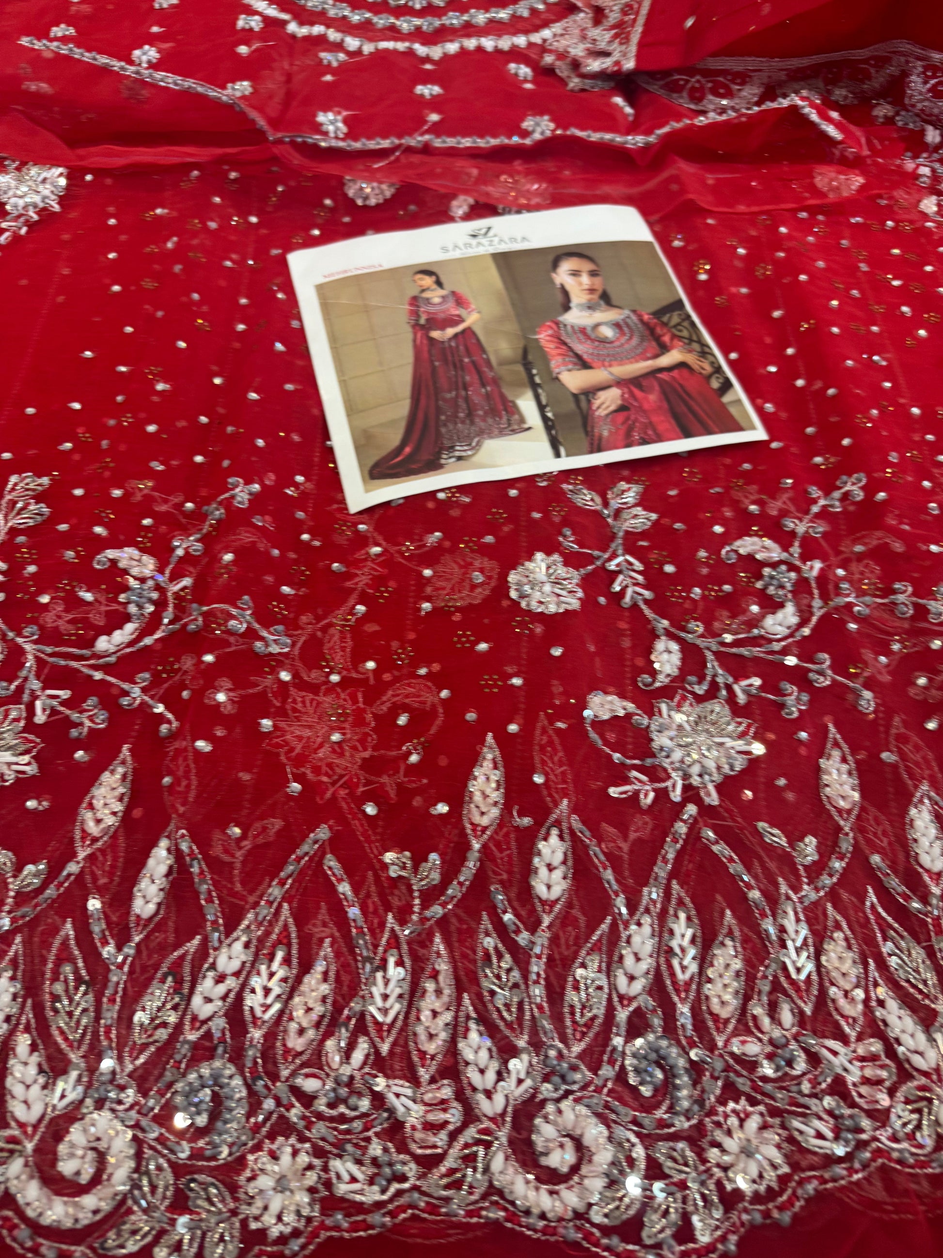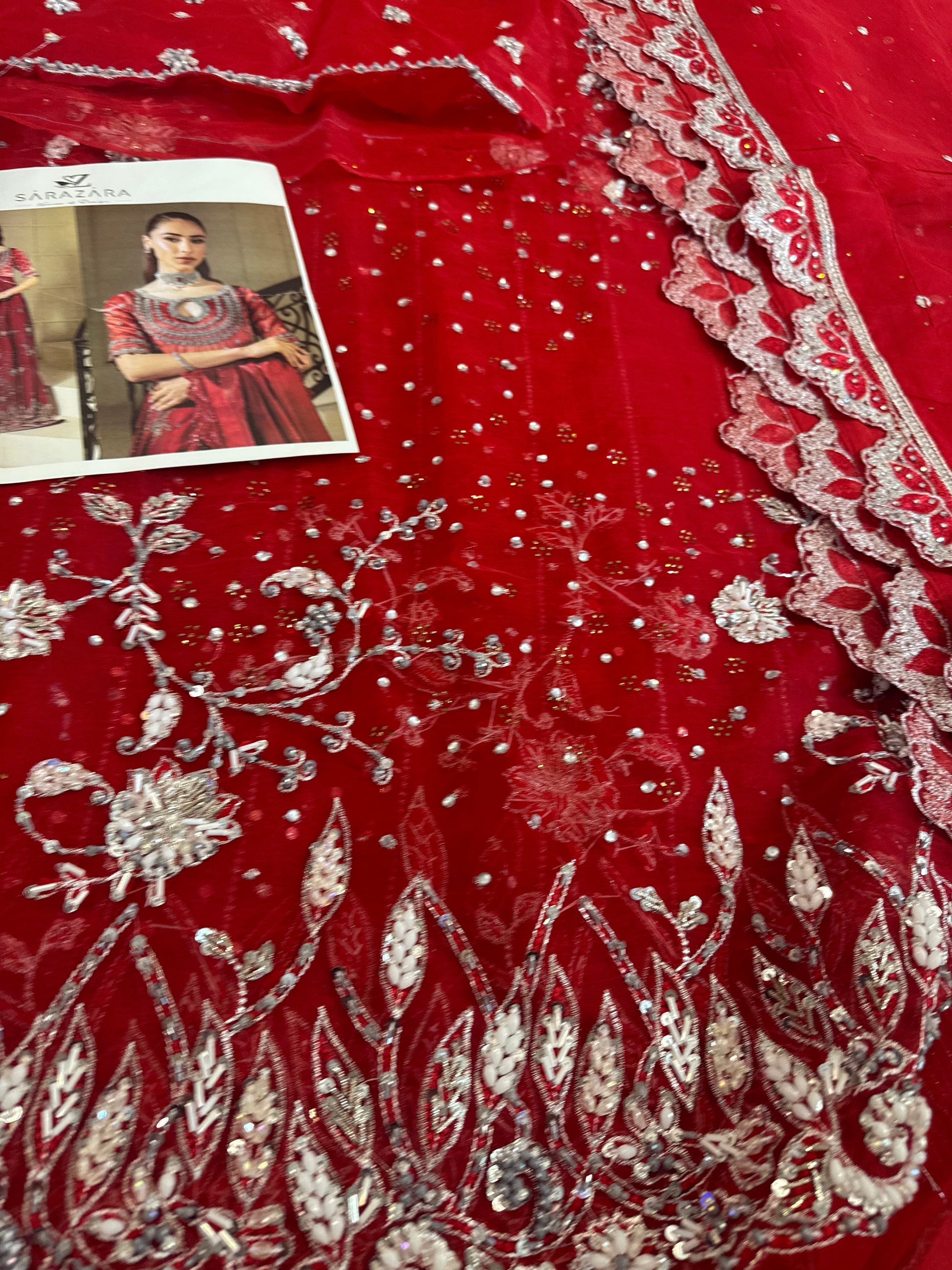 This deep merlot outfit embodies the regal elegance of Empress Mehrunnisa, capturing the significance of maroon in the Mughal royal court—a color reserved for nobility and those of high rank. Crafted from luxurious organza silk, the floor-lenght gown is hand-embellished with intricate zardozi, katdana, and sequins. The long, flowy silhouette is paired with raw silk flared sharara pants, while the dupatta glistens with moonlight stones, adding a touch of sparkle with every movement. A true representation of Mughal opulence and grace, this ensemble honors the Empress’s noble stature and timeless beauty.